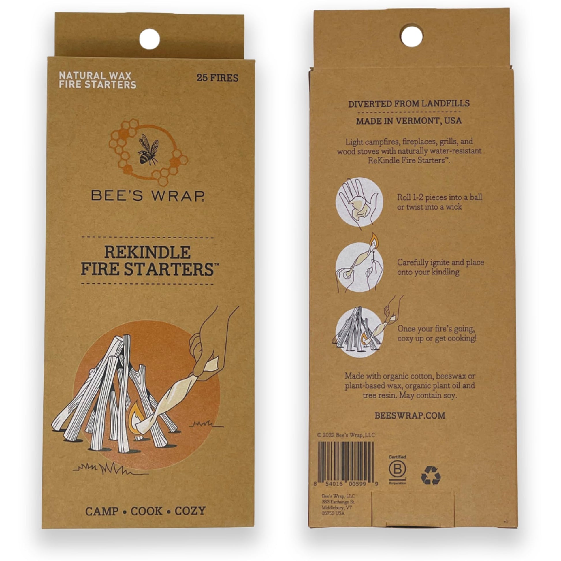 • ECO FRIENDLY FIRE STARTER is repurposed from beeswax food wrap scraps. Natural and water resistant, ReKindle is perfect for lighting your grill, fireplace, campfire, or wood stove.