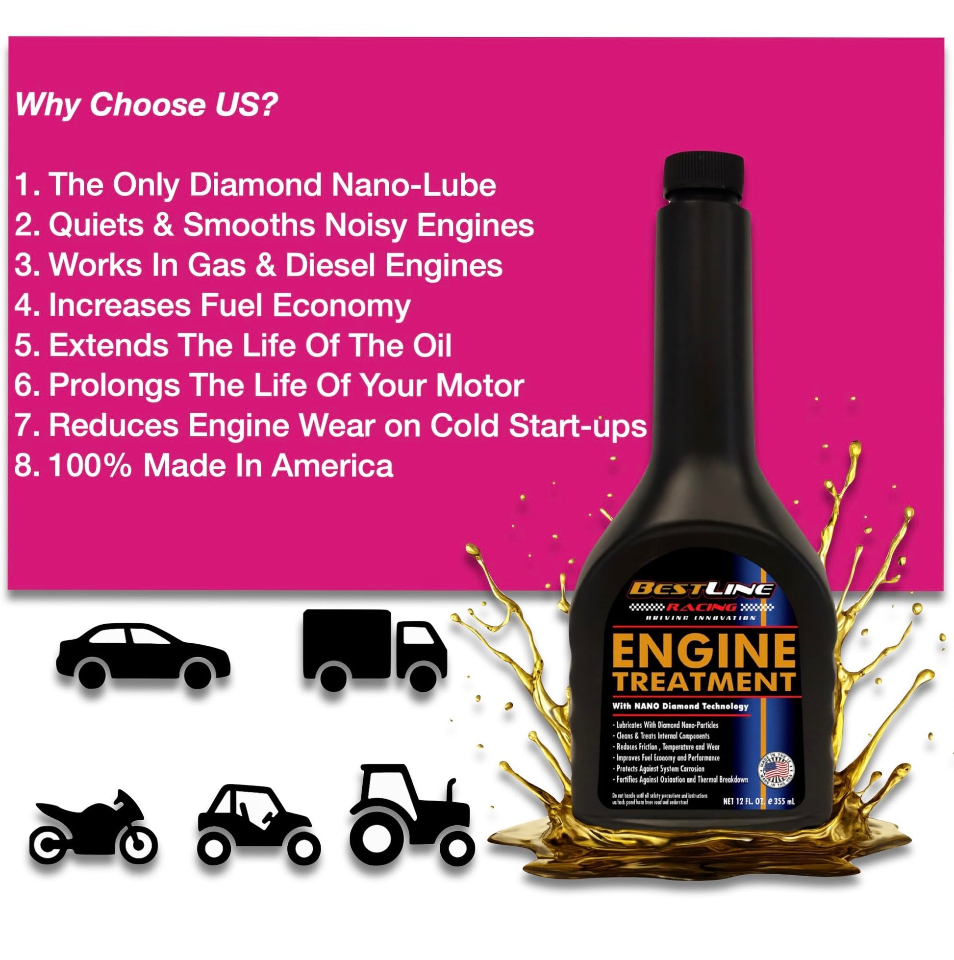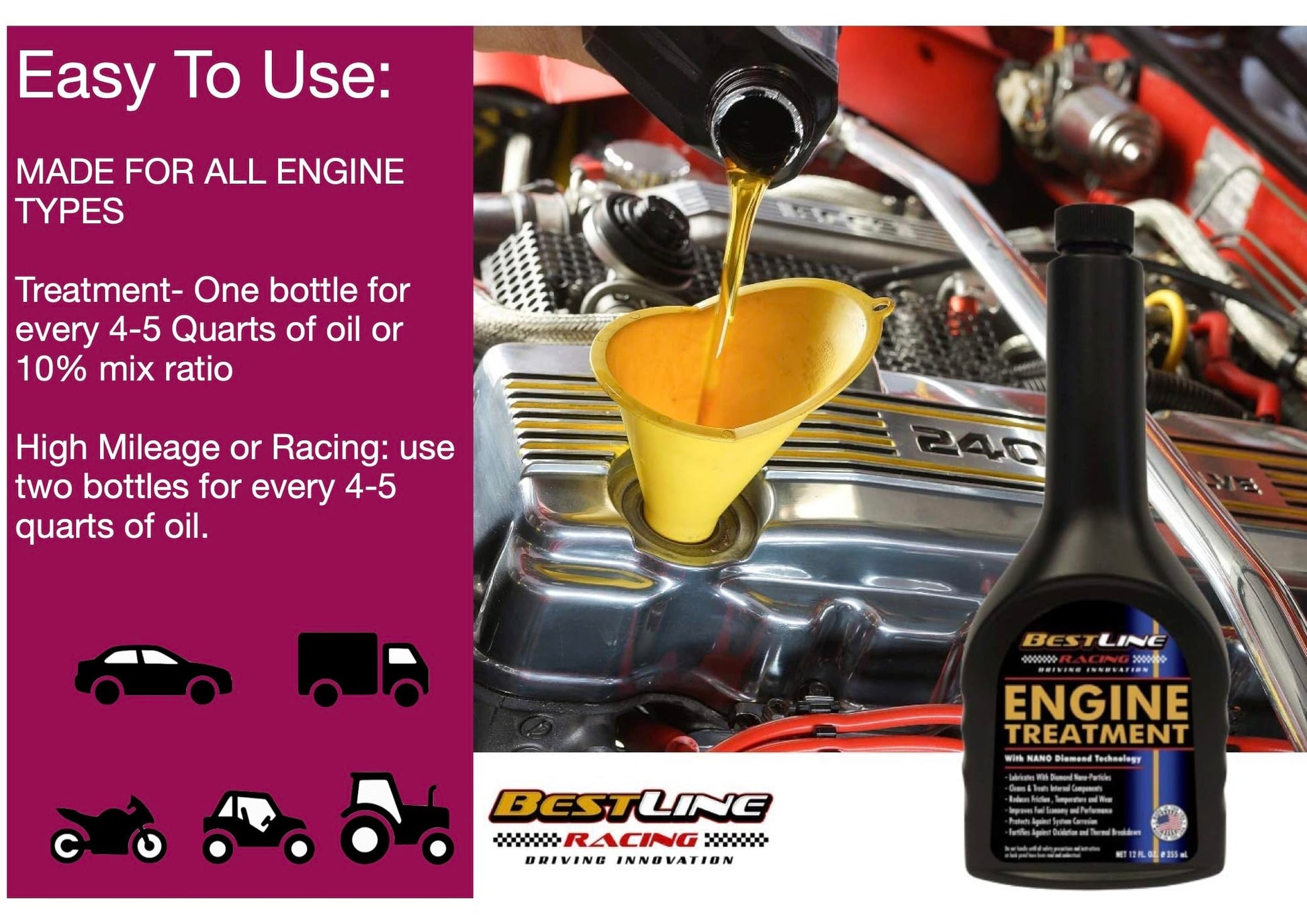- Use one bottle for every 5 quarts of oil; it is best if used at every oil change. Dual-Action Formula combines cleaning detergents with protective additives to: Remove existing sludge, Prevent new deposit formation, and neutralizes acidic oil breakdown. Restore your engine easily with BestLine Racing Diamond Nano Lube, a metal surface treatment.