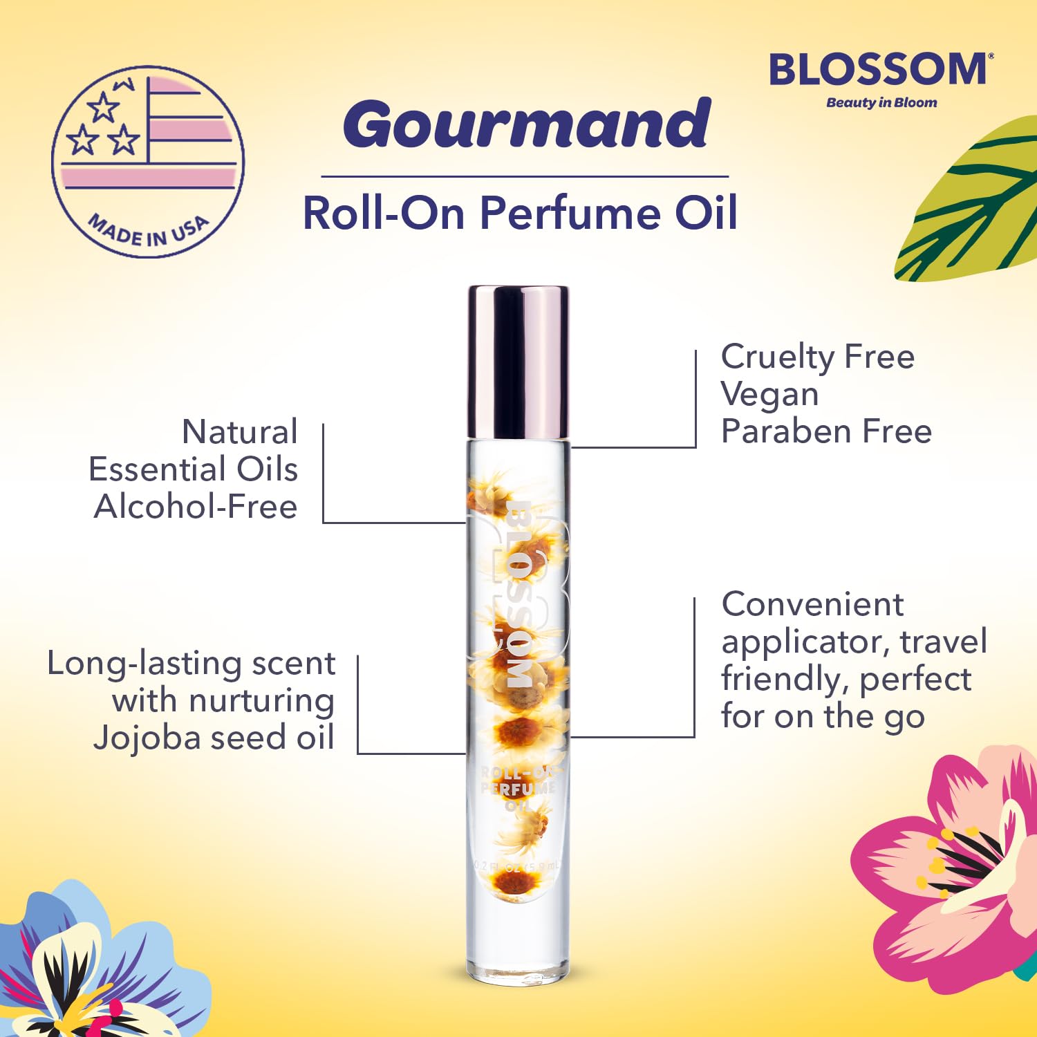 Blossom Roll on Perfume for Women Alcohol Free Gourmand Rollerball Perfume Oil with Essential Oils, Infused with Real Flowers, Made in USA, 0.20oz, (Vanilla, Caramel, Nutmeg) Almond Biscotti