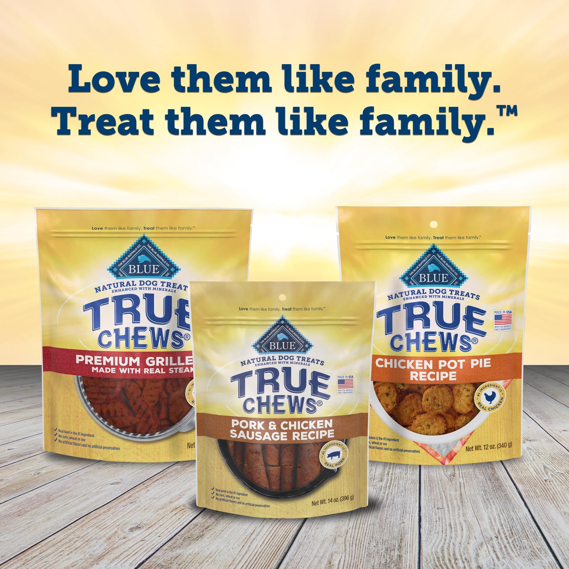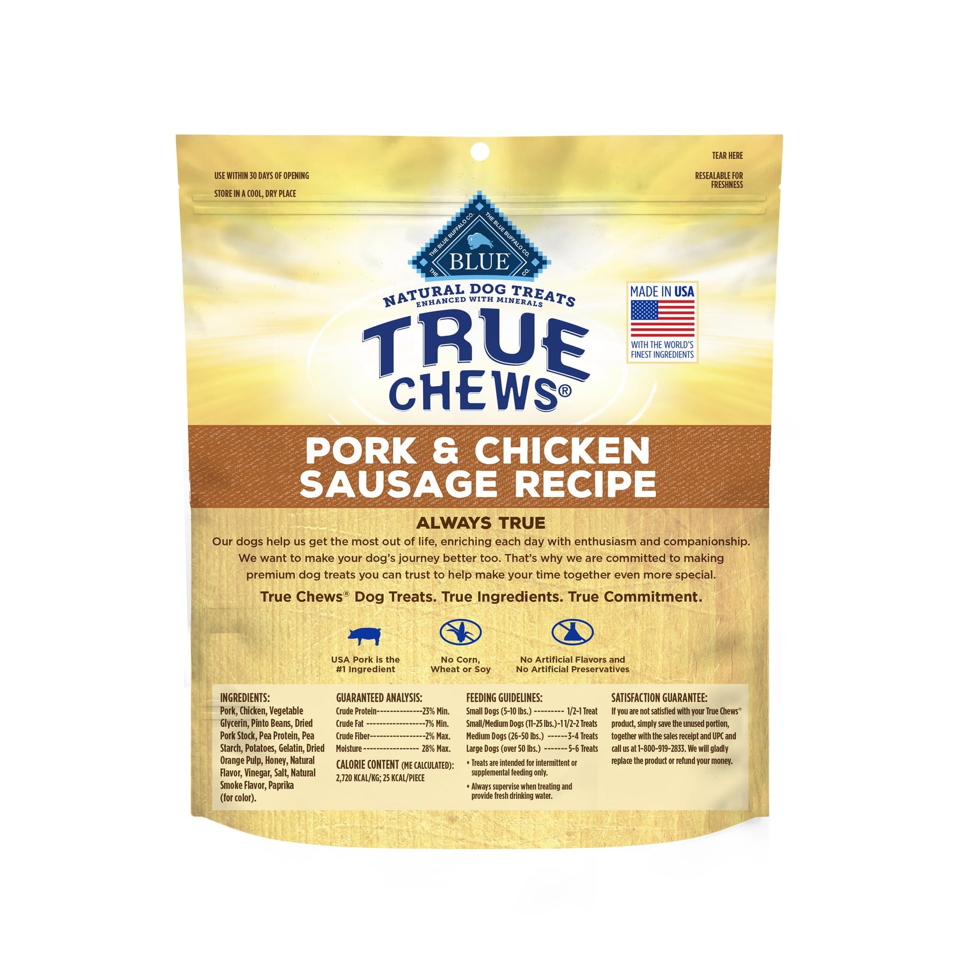 - Contains: One (1) 14-oz bag of BLUE True Chews Natural Chewy Dog Treats; Pork and Chicken Sausage Recipe