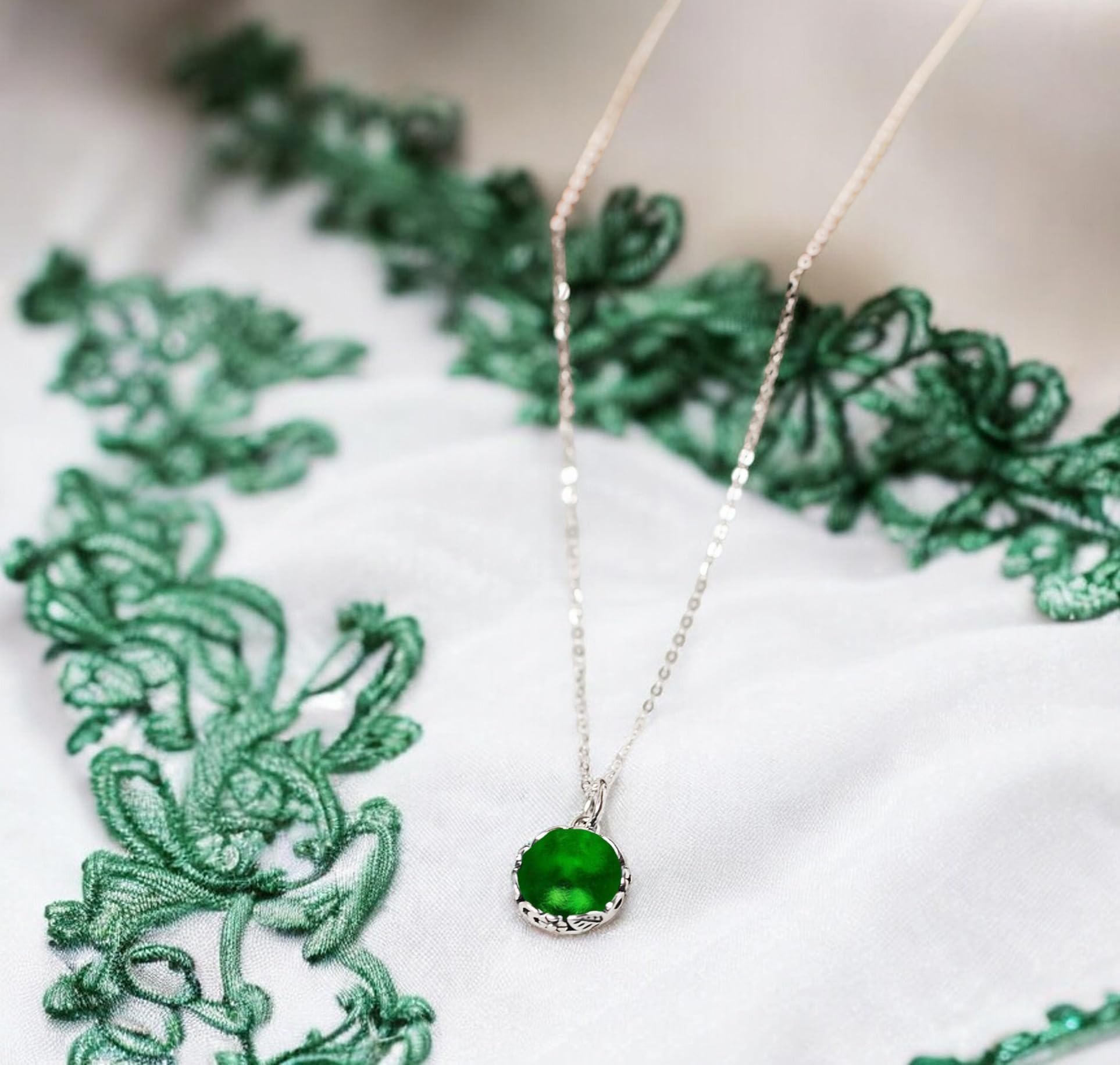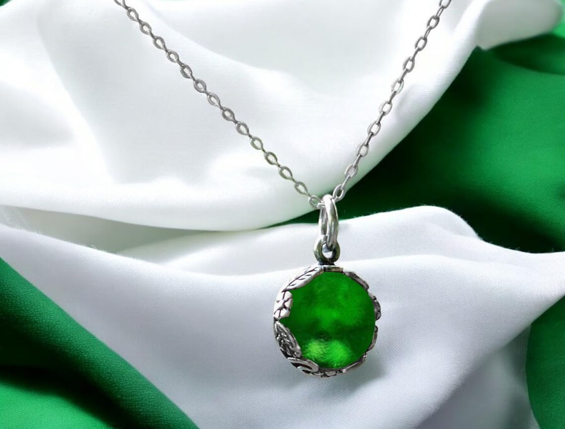 - This distinctive green necklace, created from recycled 1960s beer bottle glass and accented with sterling silver, offers a blend of vintage charm and modern style. It’s perfect for those looking to make an eco chic statement while accessorizing their daily wear or special event attire.