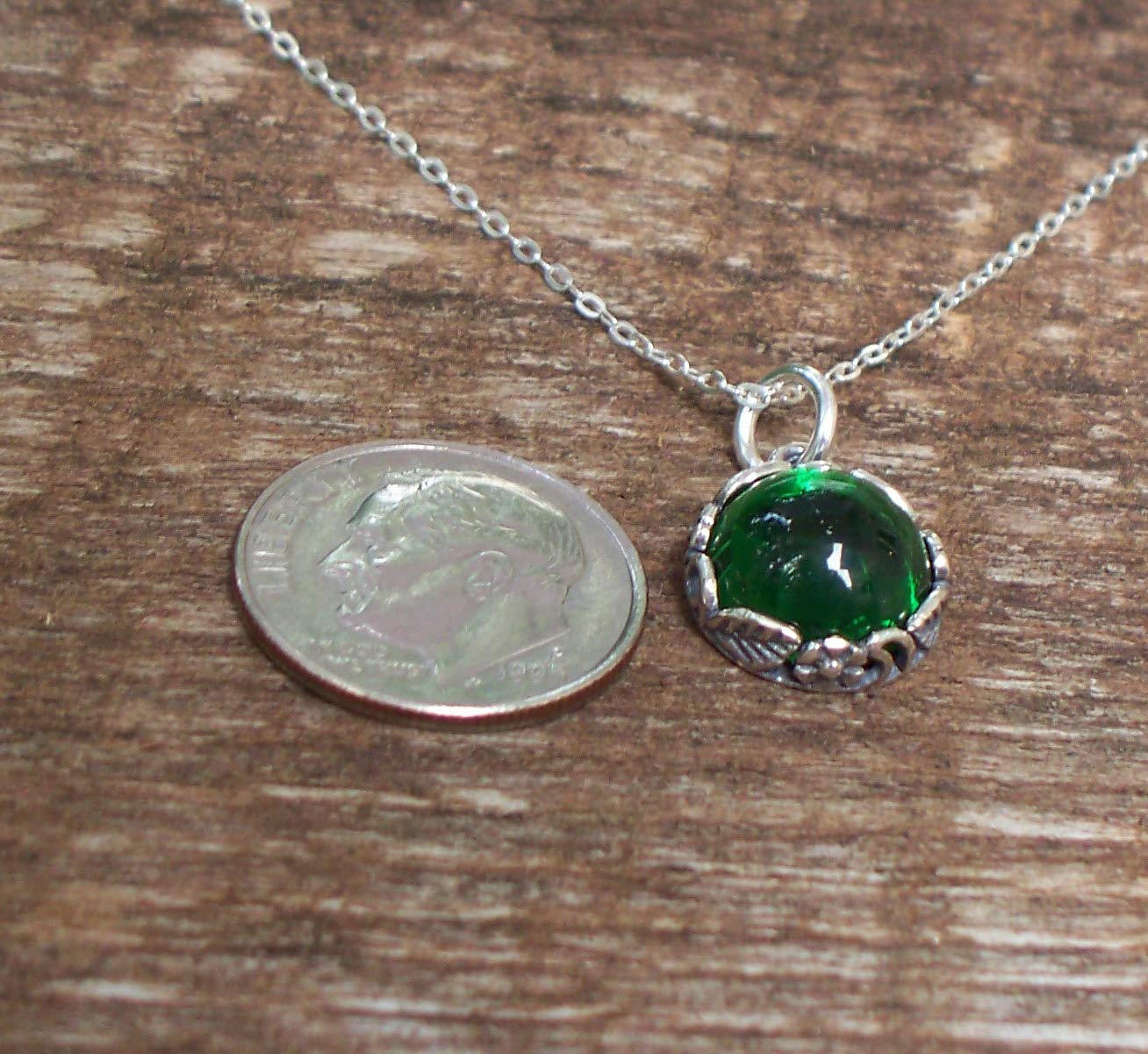 Details: Handmade in Pennsylvania from the broken reclaimed antique and vintage glass gathered from old glass and bottle dumps found so commonly in the beautiful Pennsylvania Amish Country! Glass from broken vintage 1960's green beer bottles is taken from the wooded habitats and rural farmlands, ground and fired in glowing 10 mm "gems" and set inside our lovely sterling silver botanical collection setting framing the glass in leaves, flowers and vines. Includes 18" sterling silver chain. Each piece includes "The Story of the Glass" detailing the history and age of the glass used.