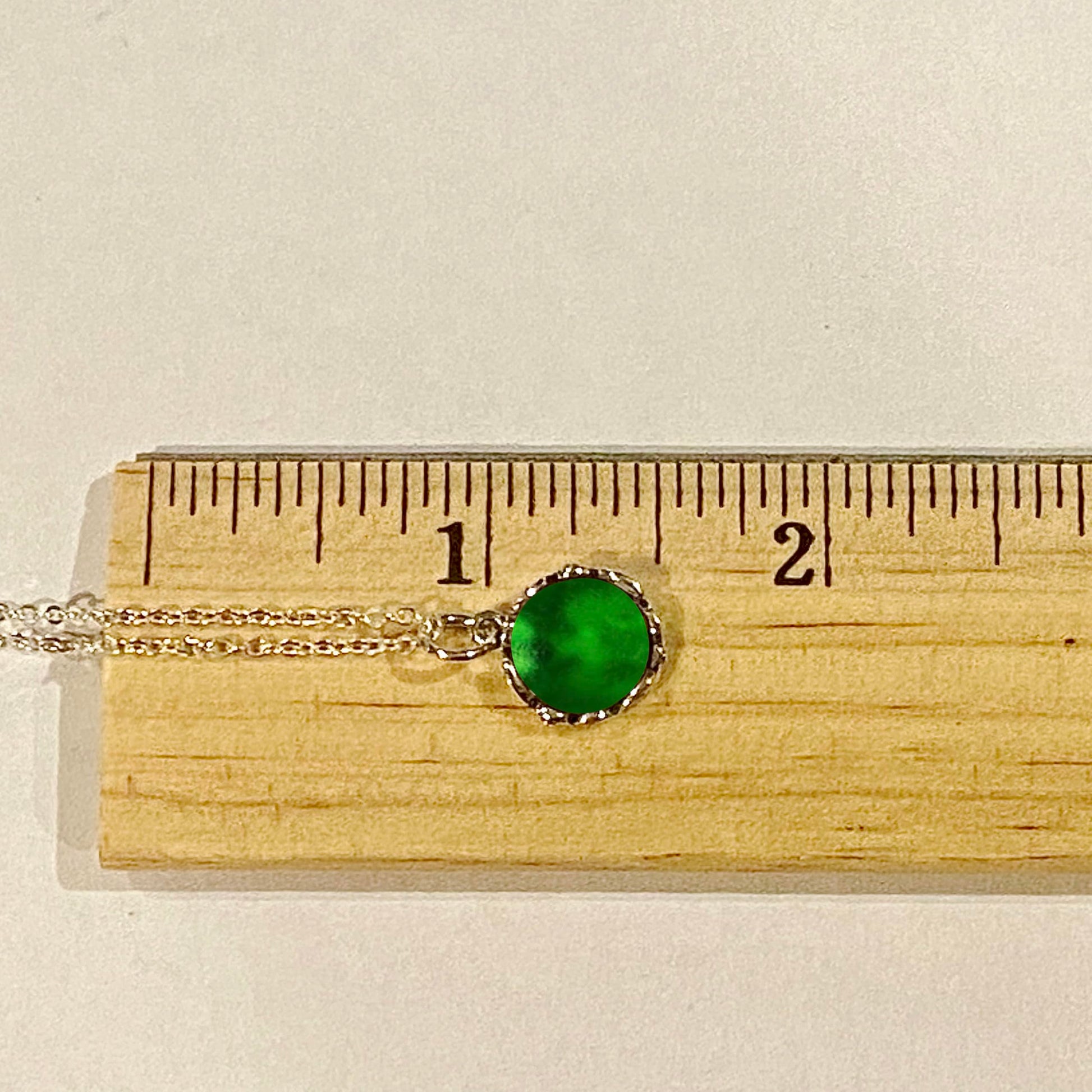- Enhance your jewelry collection with this handmade green necklace, crafted from recycled 1960s beer bottle glass and sterling silver. The vibrant green hue and sleek design make it a standout accessory, perfect for adding a pop of color to any outfit.