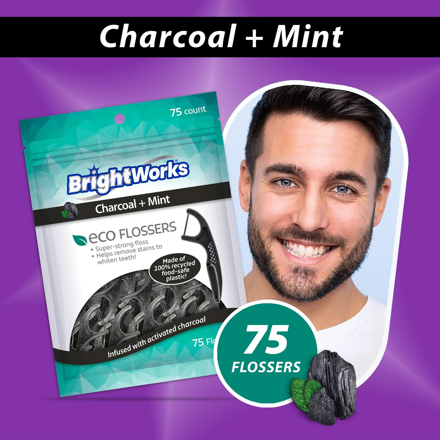 Brightworks ECO Sustainable Floss Picks - 225 Count - PTFE & PFAS Free - Made in USA Charcoal + Mint Infused 100% Post-Consumer Recycled Plastic with Micro-Crystals for Oral Care Hygiene Gum Health