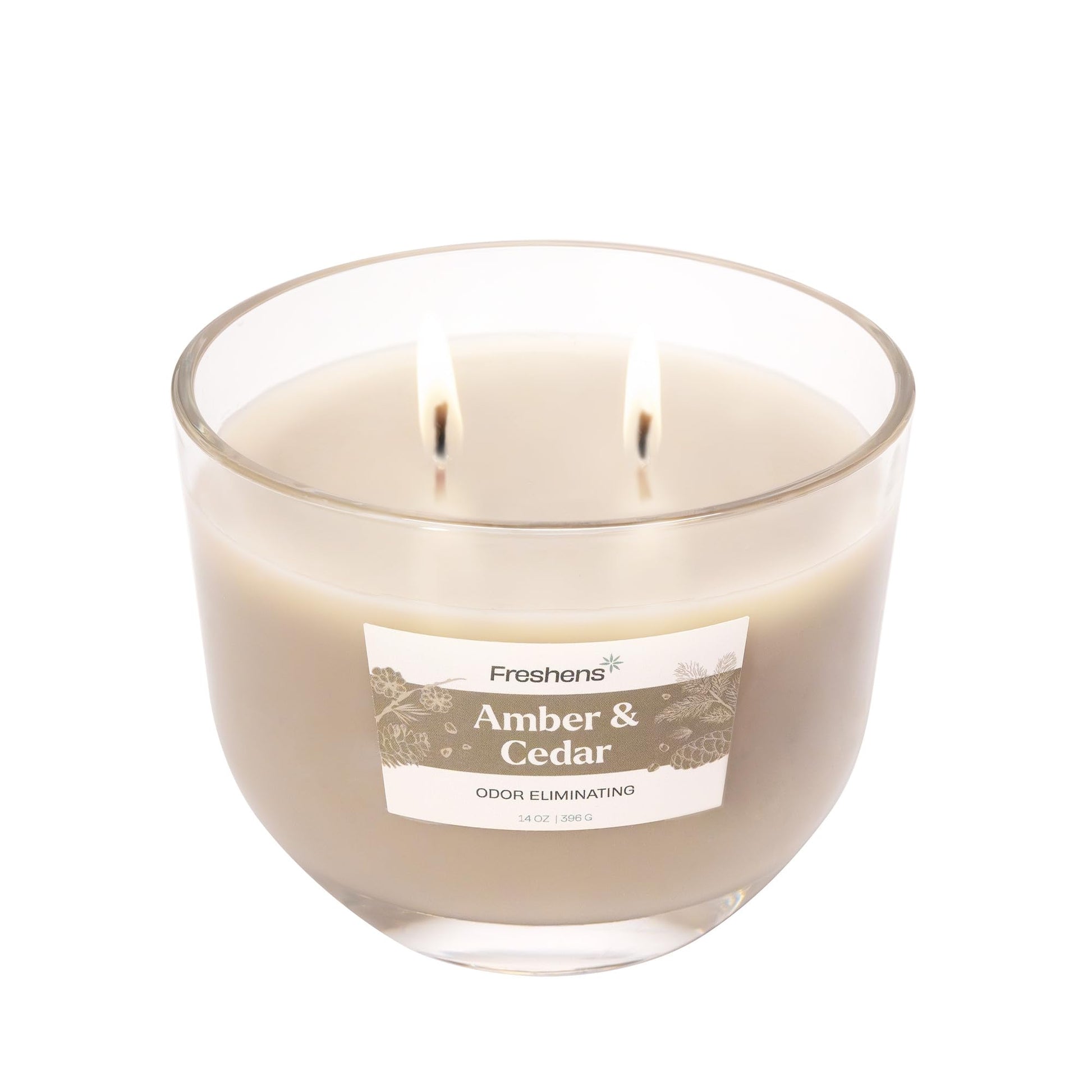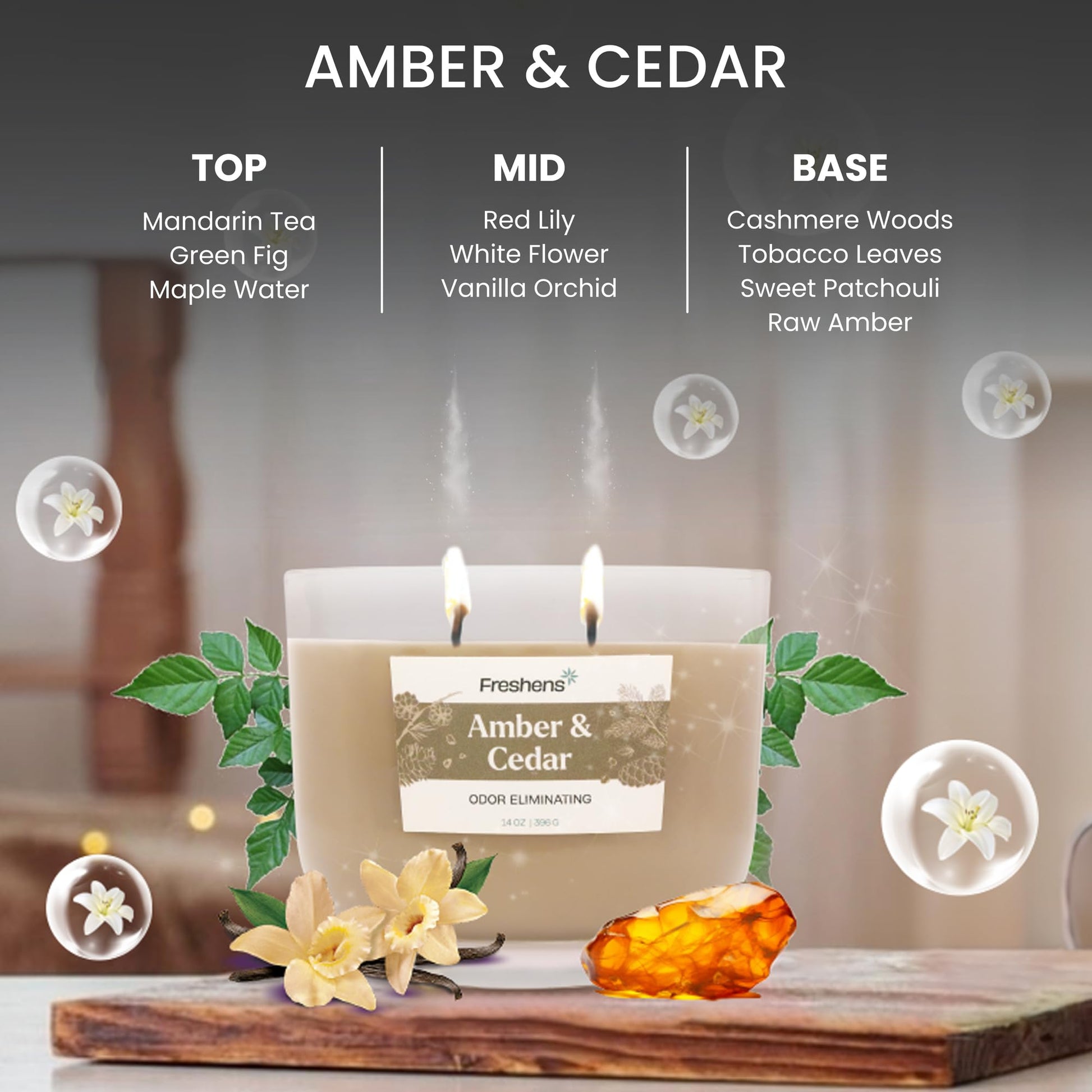Carolina Freshens Amber & Cedar Odor Eliminating Highly Fragranced Candle for Home Scented, Eliminates 90% of Pet, Smoke, Food and Other Smells Quickly, 2 Wick, 14 oz - Made in The USA
