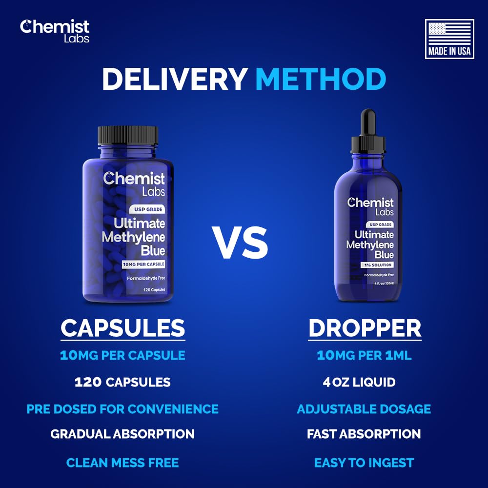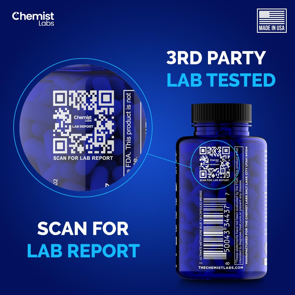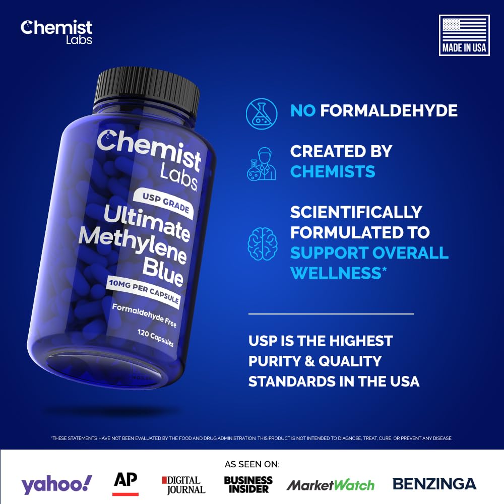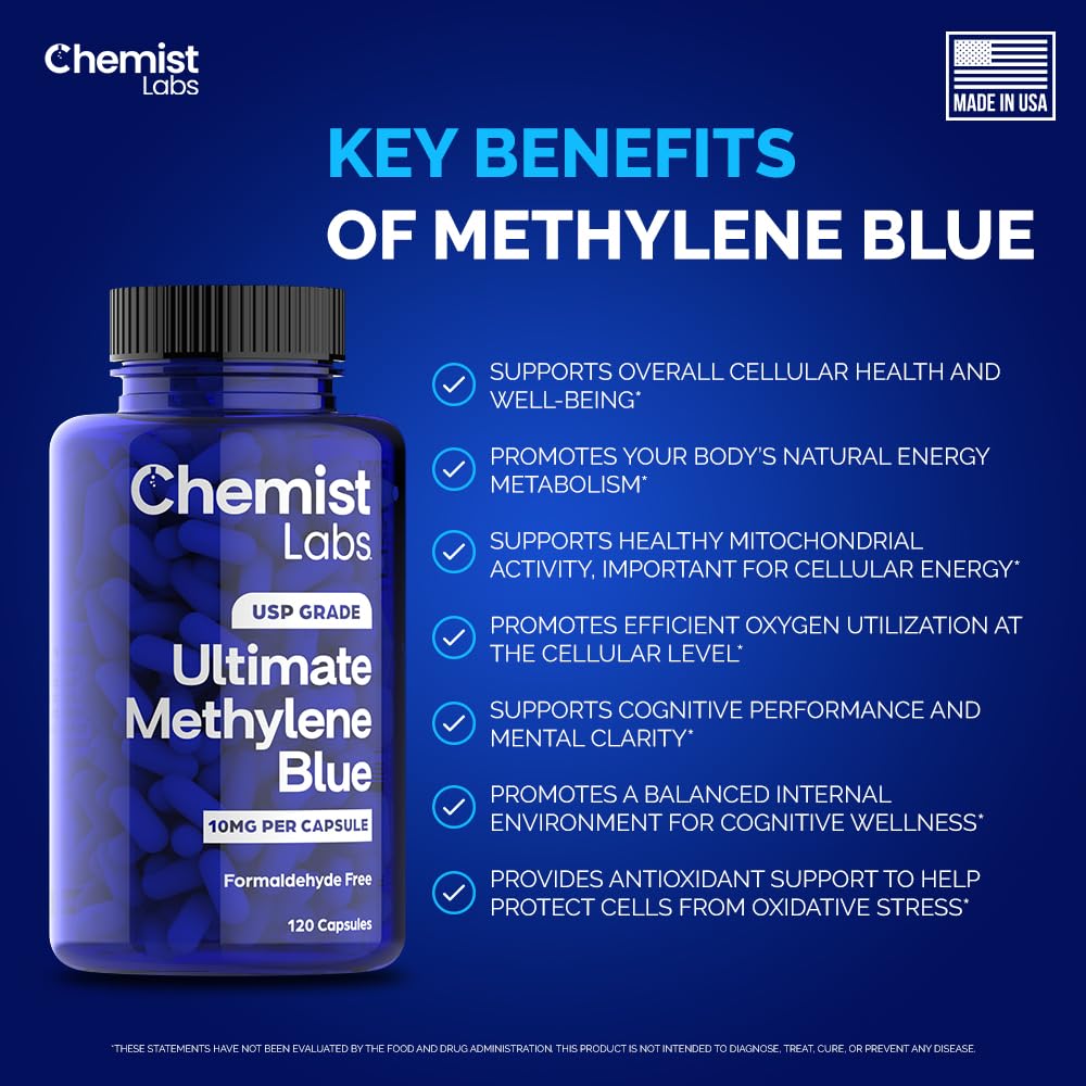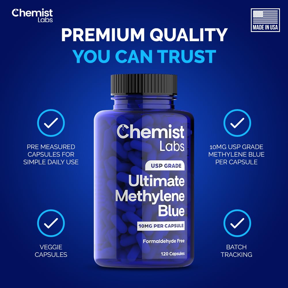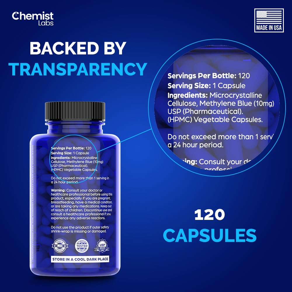 Chemist Labs Methylene Blue | 10mg USP Grade Capsules | 120 Count | Pharmaceutical Grade | Cellular & Mitochondrial Support | Formaldehyde Free | Made in USA (120 Capsules)