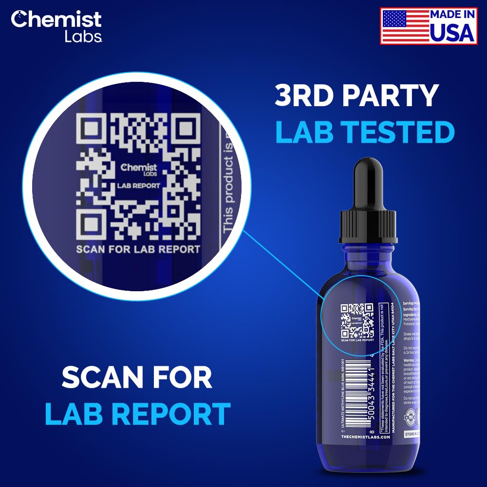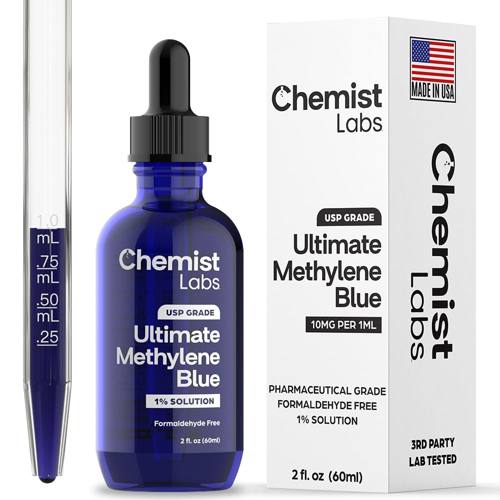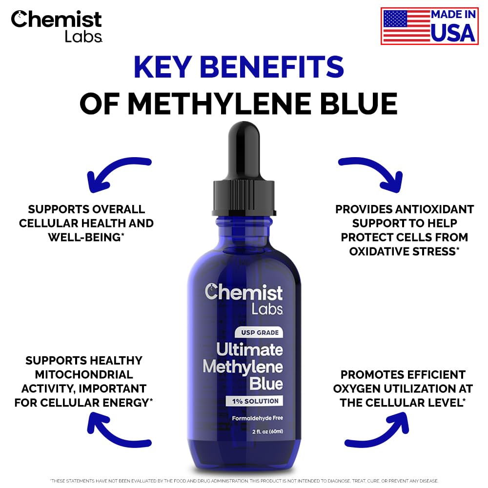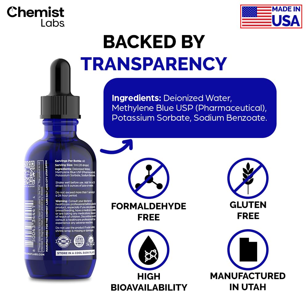 Chemist Labs Methylene Blue Drops Pharmaceutical Grade - 99% Purity USP Grade, Blue Methylene, Cellular & Mitochondrial Support, Third-Party Tested, Made in USA, 2oz