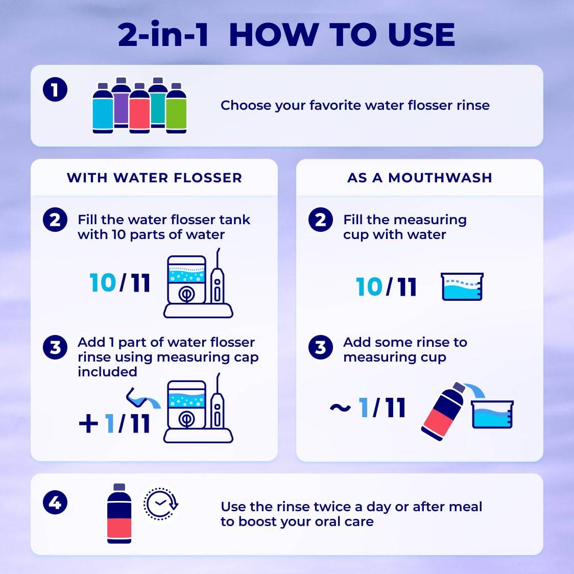 - 2IN1 : use as water flosser additive or ordinary mouthwash for everyday oral care
