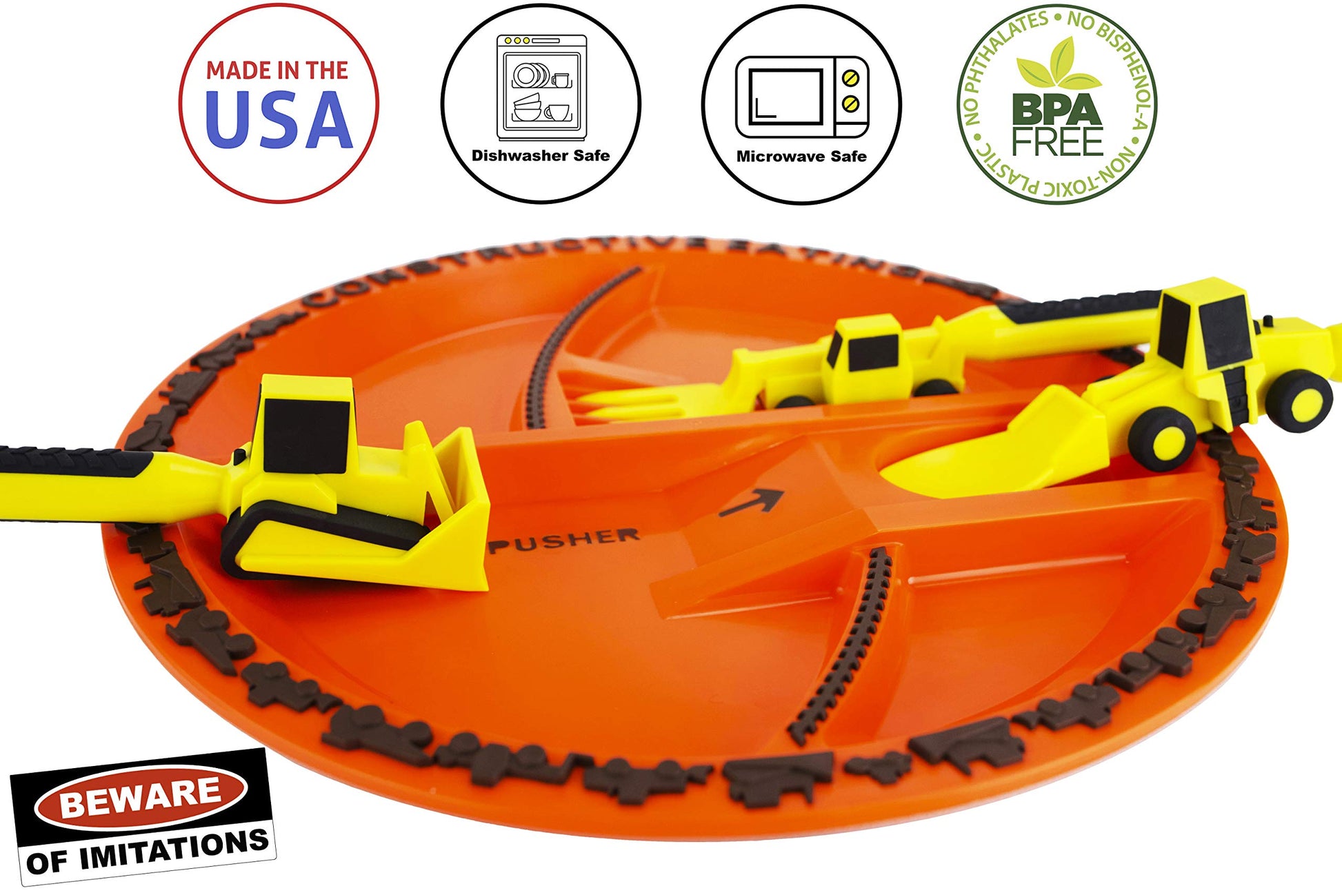 Constructive Eating Plate and Utensils Set - USA-Made Toddler Dinnerware with Divided Plates (Construction)