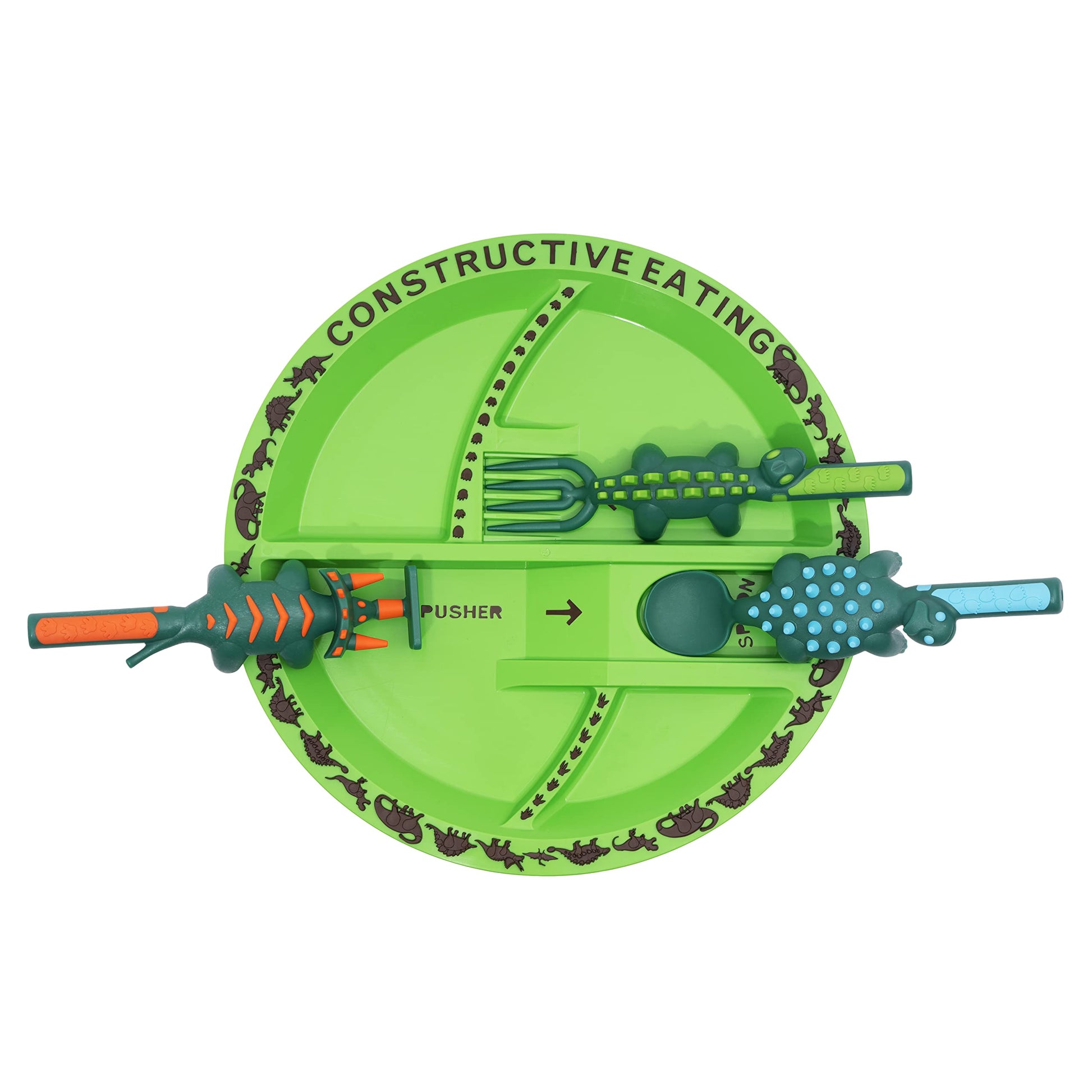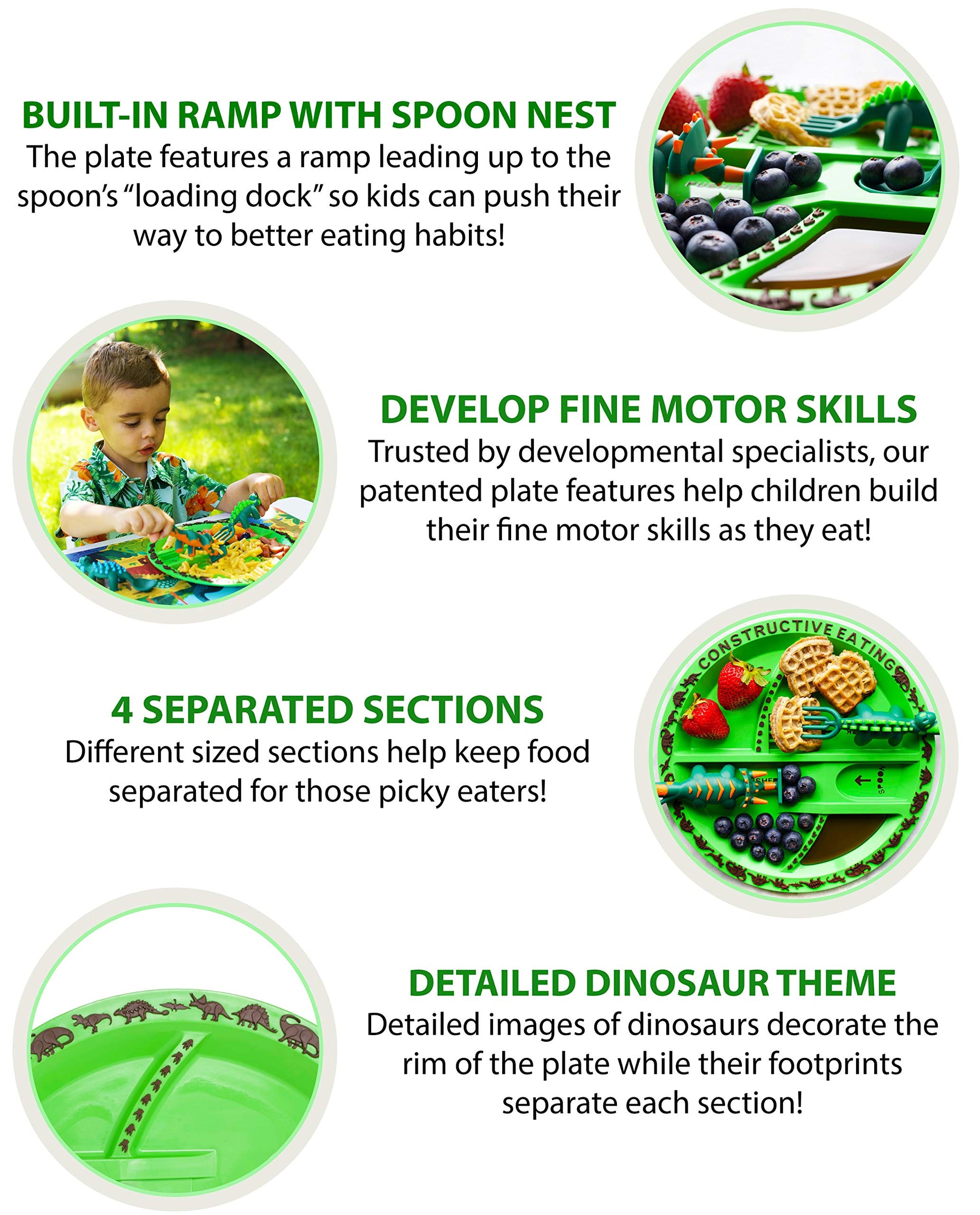 Constructive Eating Plate and Utensils Set - USA-Made Toddler Dinnerware with Divided Plates (Dinosaur)