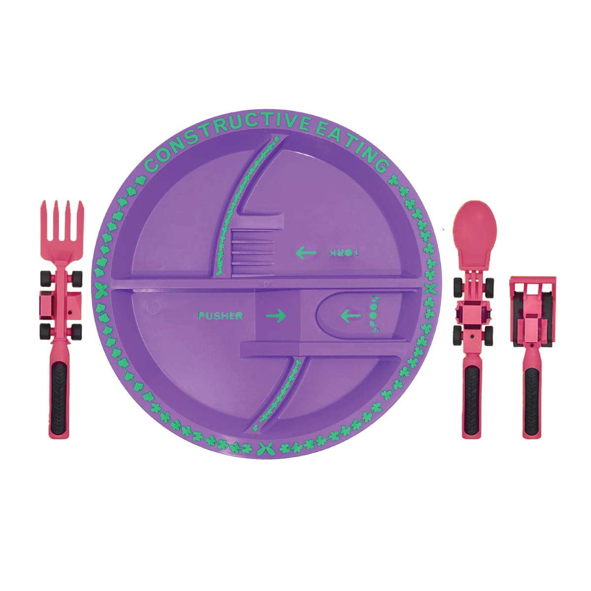 Details: Build healthy eating habits with the Plate and Set of 3 Utensils. These fun and exciting products keep kids engaged during mealtime and encourage independence and imagination. Use the Pusher to push food up the plate’s ramp and watch it drop into the Spoon. Park the Fork in the backstop on the plate to corner those tricky peas. The Plate is microwave safe and both the Plate and Utensils are dishwasher safe for easy clean up. This set makes the perfect gift for any little one! - Unleash Creativity at Every Meal: Fuel curiosity and creativity with the enticing array of Toddler Plates and Utensils Sets, inspiring kids to explore textures, flavors, and imaginative play. Experience peace of mind with our Food Safety Tested Materials. - Versatile Plates for Toddlers 1-3: Crafted for growing appetites, our range of Plates for Toddlers 1-3 offers a seamless transition from early self-feeding to independent mealtime adventures. Unleash the power of Microwave and Dishwasher Safe convenience. - Wholesome Dining with Toddler Plate Set: Elevate mealtime rituals with the captivating Toddler Plate Set, cultivating a love for food and nourishment through engaging designs and interactive utensils. Prioritize safety with materials that are BPA, Phthalate, PVC, Lead, and Paint-Free. - Quality Assured for Growing Explorers: Experience the confidence of dining essentials that prioritize safety, with our meticulously crafted Toddler Plates and Utensils Set. Enjoy mealtime with utensils that combine Eating and Play seamlessly. - Celebrate Milestones with Constructive Eating: Make every bite a step towards growth and discovery, as your child enjoys the tactile joy of our expertly designed Toddler Plate collection. Embrace a nourishing journey with materials that are both safe and engaging.