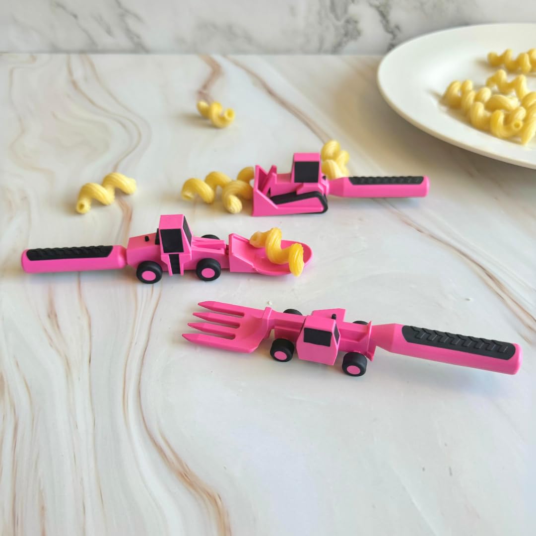 Constructive Eating Plate and Utensils Set - USA-Made Toddler Dinnerware with Divided Plates (Pink Construction)