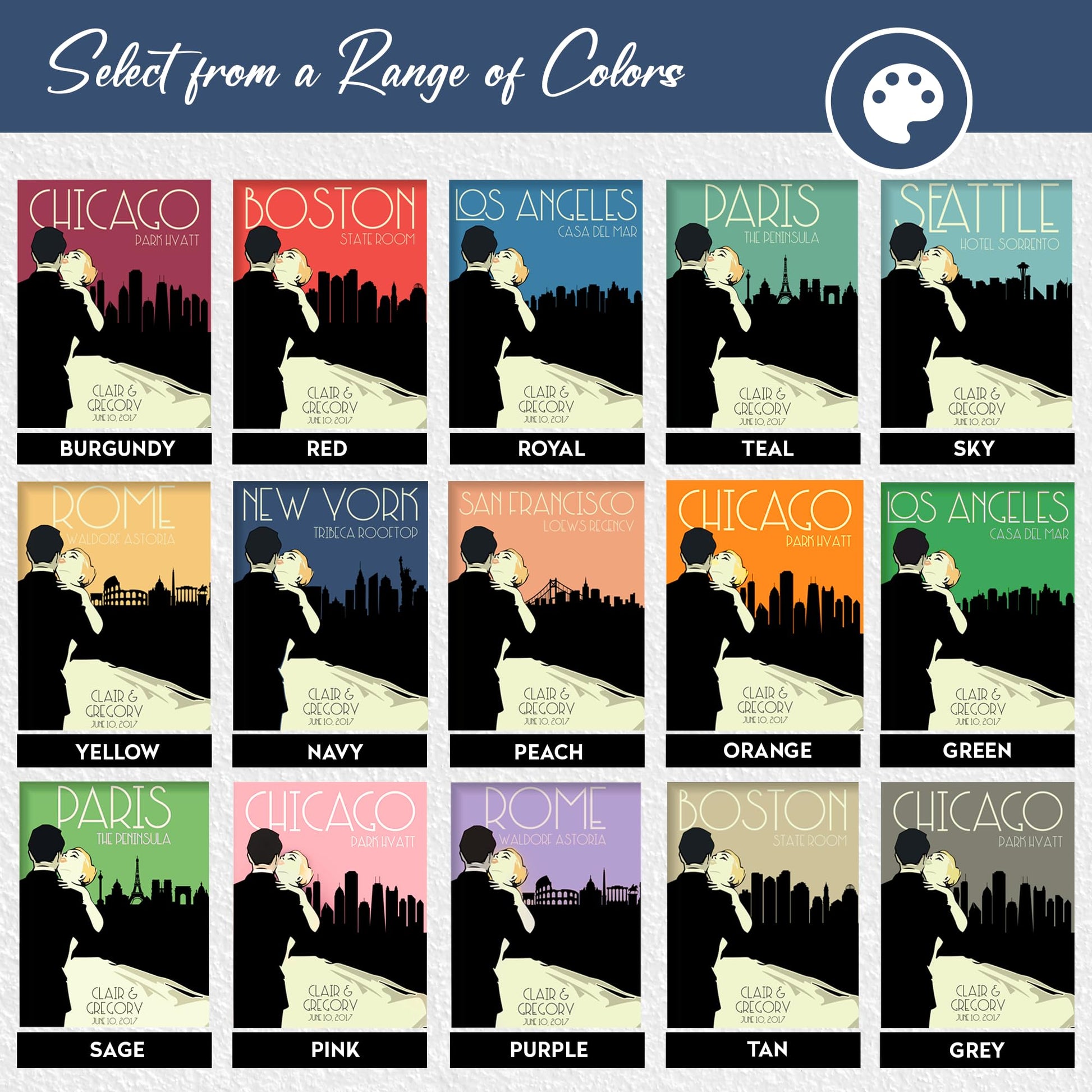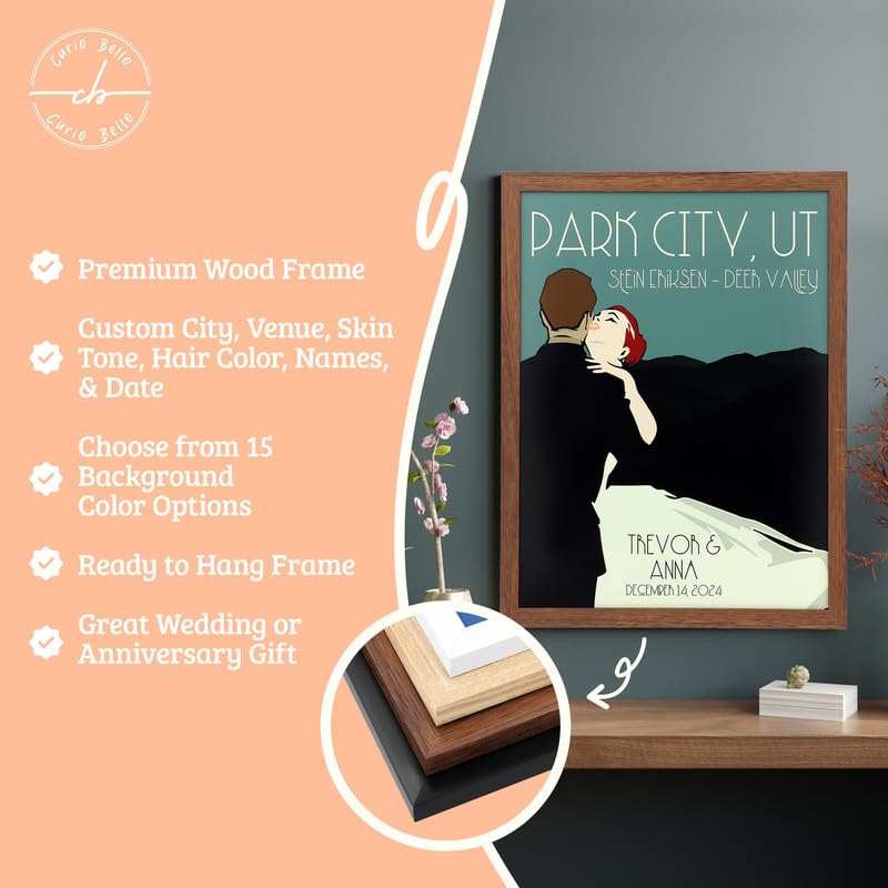 - ULTIMATE CUSTOMIZATION: Choose from over 15 Cities, 15 Background Colors, 3 Frame Types, Custom Wedding Venue Text, Custom Couples Names, Custom Hair Color, Custom Skin Tone! Sized at 16"x20".