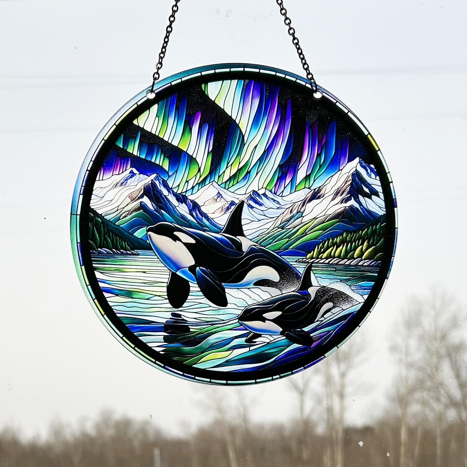d'ears - Orca Northern Lights - Acrylic Suncatcher with Chain - 6 Inch Diameter - Colorful - Nature - Window Art - Made in The USA