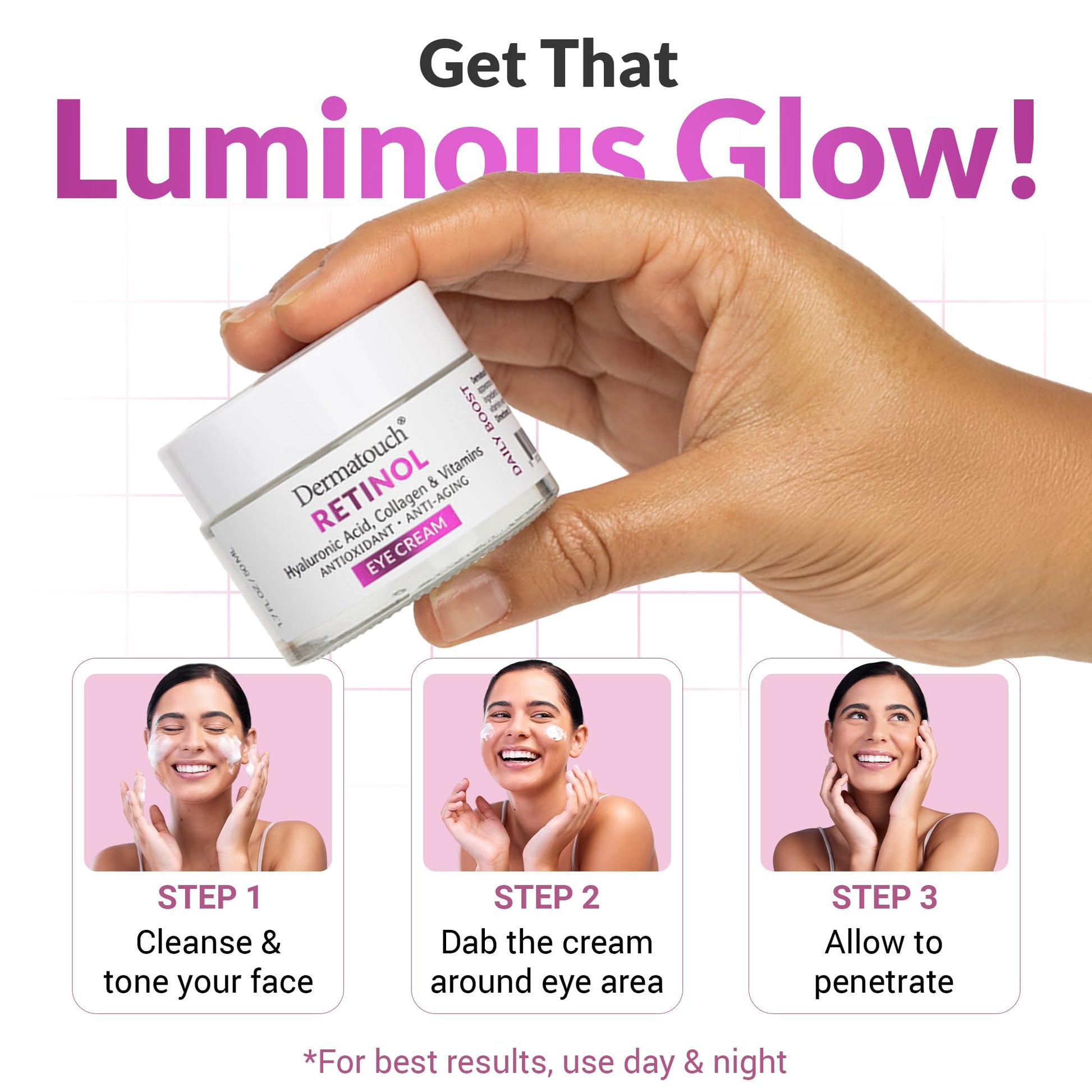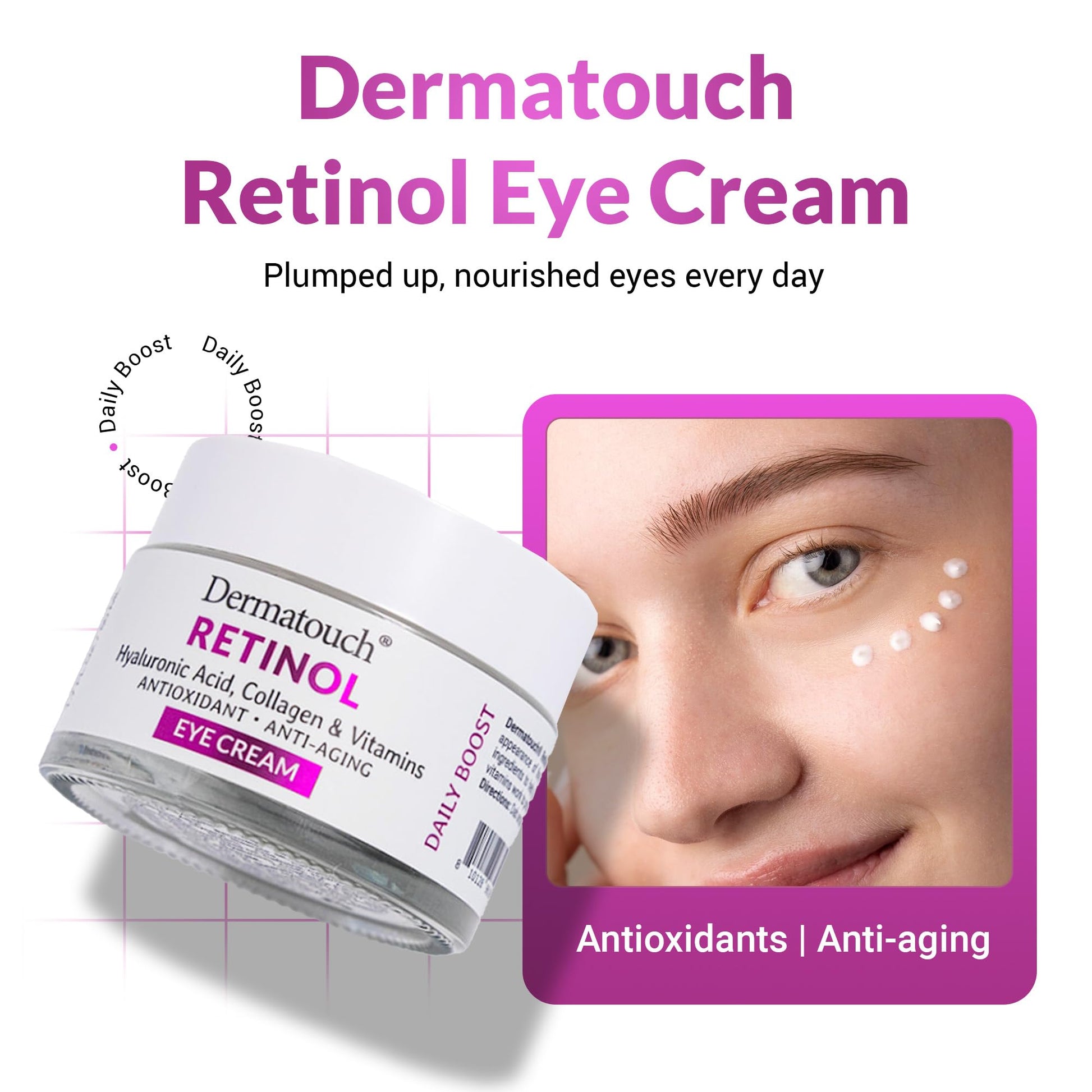 - Revitalize Your Gaze - Dermatouch Collagen Eye Cream, with hyaluronic acid and caffeine, is formulated to nourish and moisturize the delicate under-eye area. This under eye cream is designed to address fine lines, wrinkles, and dark circles.