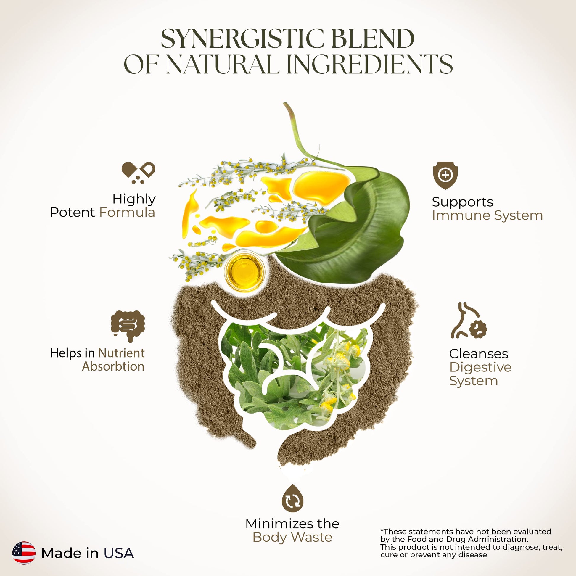 - WORMWOOD SUPER W BLEND – An effective Digestive Aid, Optimizes Nutrient Absorption and Normal Detoxification Process. The supplement contains a synergistic blend of Identity checked and Purity tested Freshly Milled Wormwood (Artemisia absinthium), Quassia in Pure Capsules*