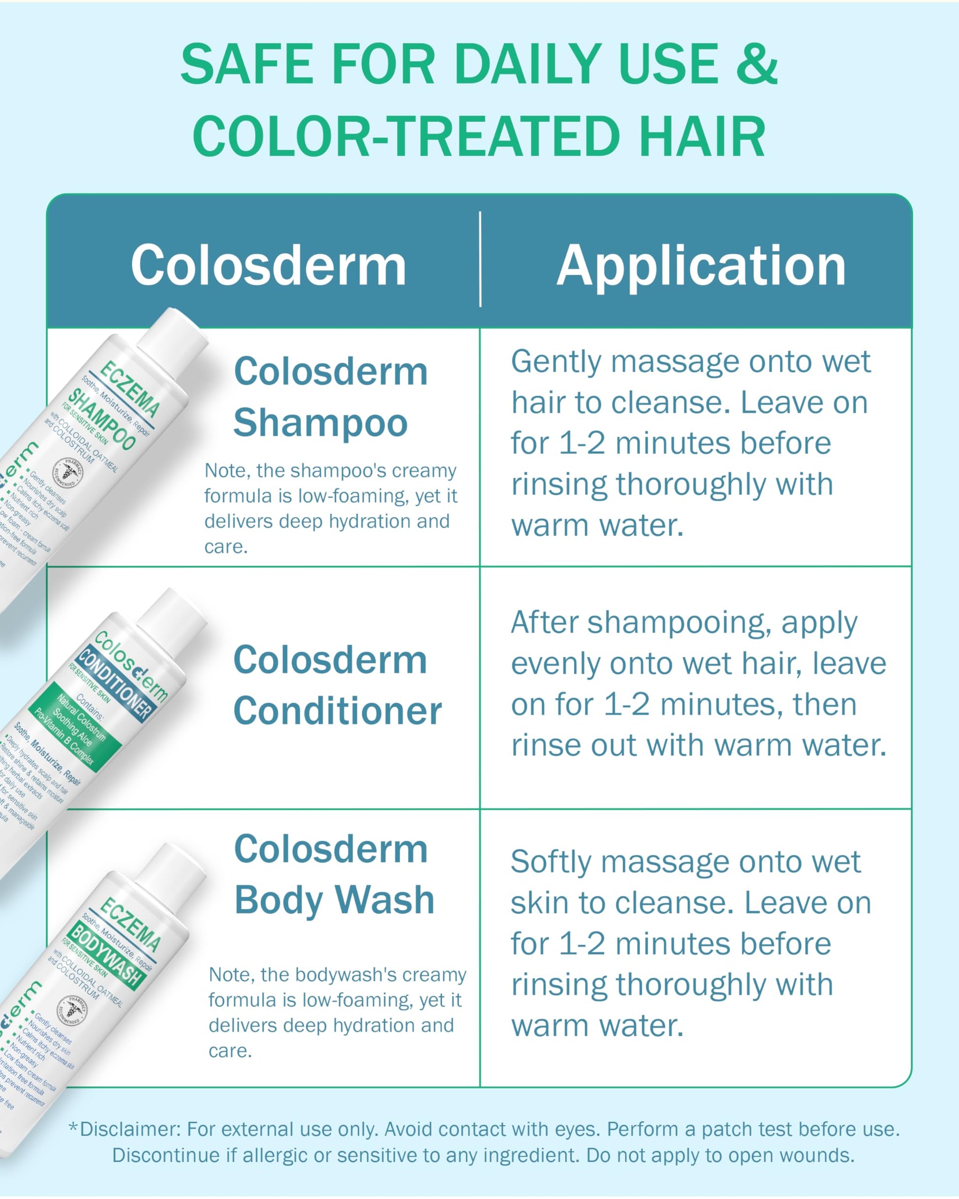 - Delicate Cleanse and Care: Clear away dirt, excess oil, and buildup while infusing your scalp and strands with essential moisture. Our Colosderm Moisturizing Eczema shampoo for itchy scalp for women and men, softens, and detangles hair, with deep nourishment from root to tip.