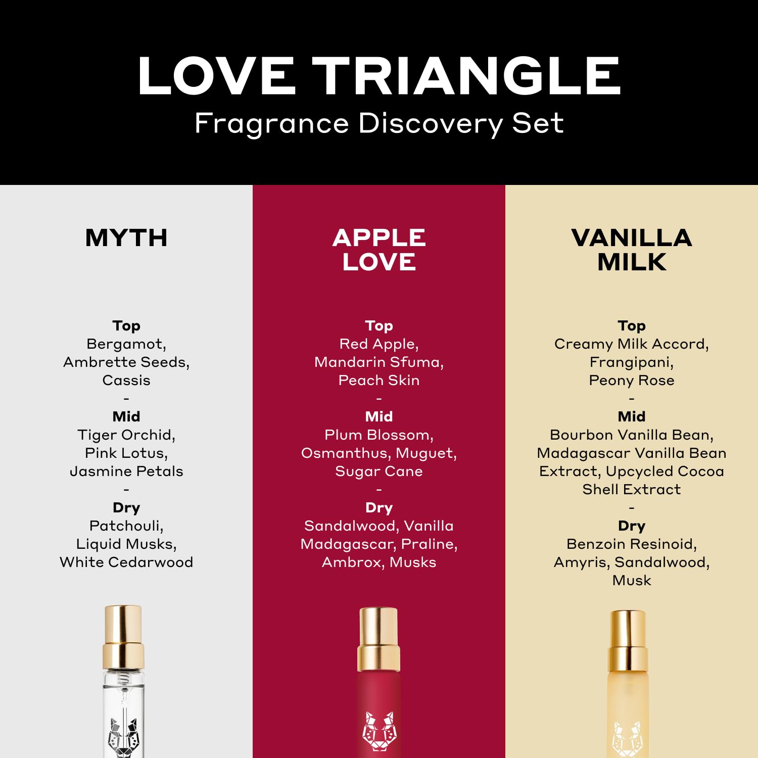 - This LOVE TRIANGLE gift set contrasts the delicious addictiveness of APPLE LOVE and VANILLA MILK eau de parfums with the clean sheet-bare skin vibe of MYTH eau de parfum.