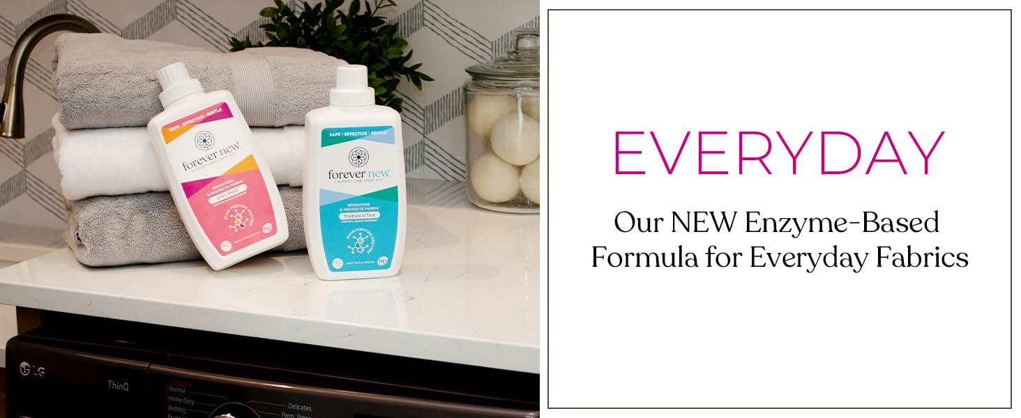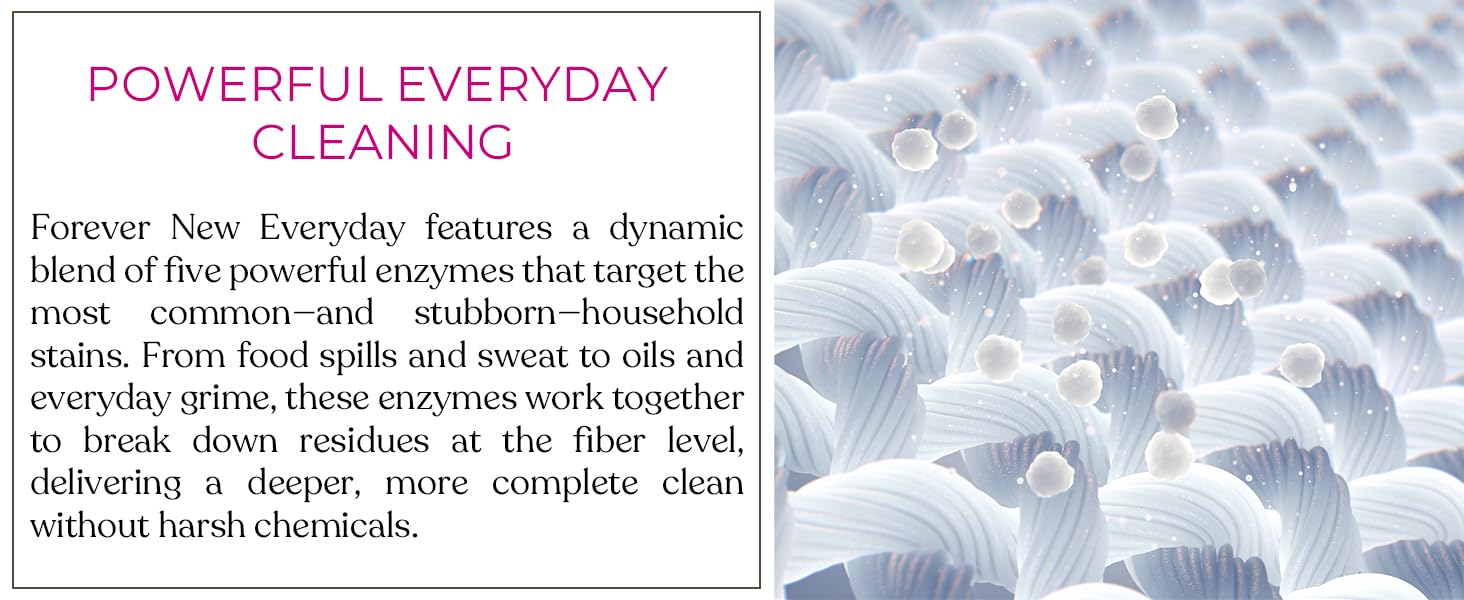 - Powerful Everyday Cleaning Forever New Everyday features a dynamic blend of five powerful enzymes that target the most common—and stubborn—household stains. From food spills and sweat to oils and everyday grime, these enzymes work together to break down residues at the fiber level, delivering a deeper, more complete clean without harsh chemicals.