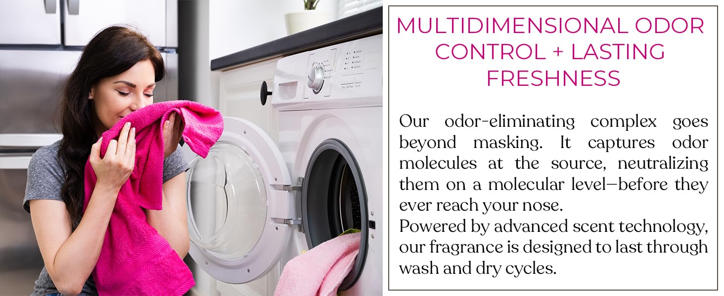 - Multidimensional Odor Control + Lasting Freshness Not just clean—refreshingly clean. Our odor-eliminating complex goes beyond masking. It captures odor molecules at the source, neutralizing them on a molecular level—before they ever reach your nose.