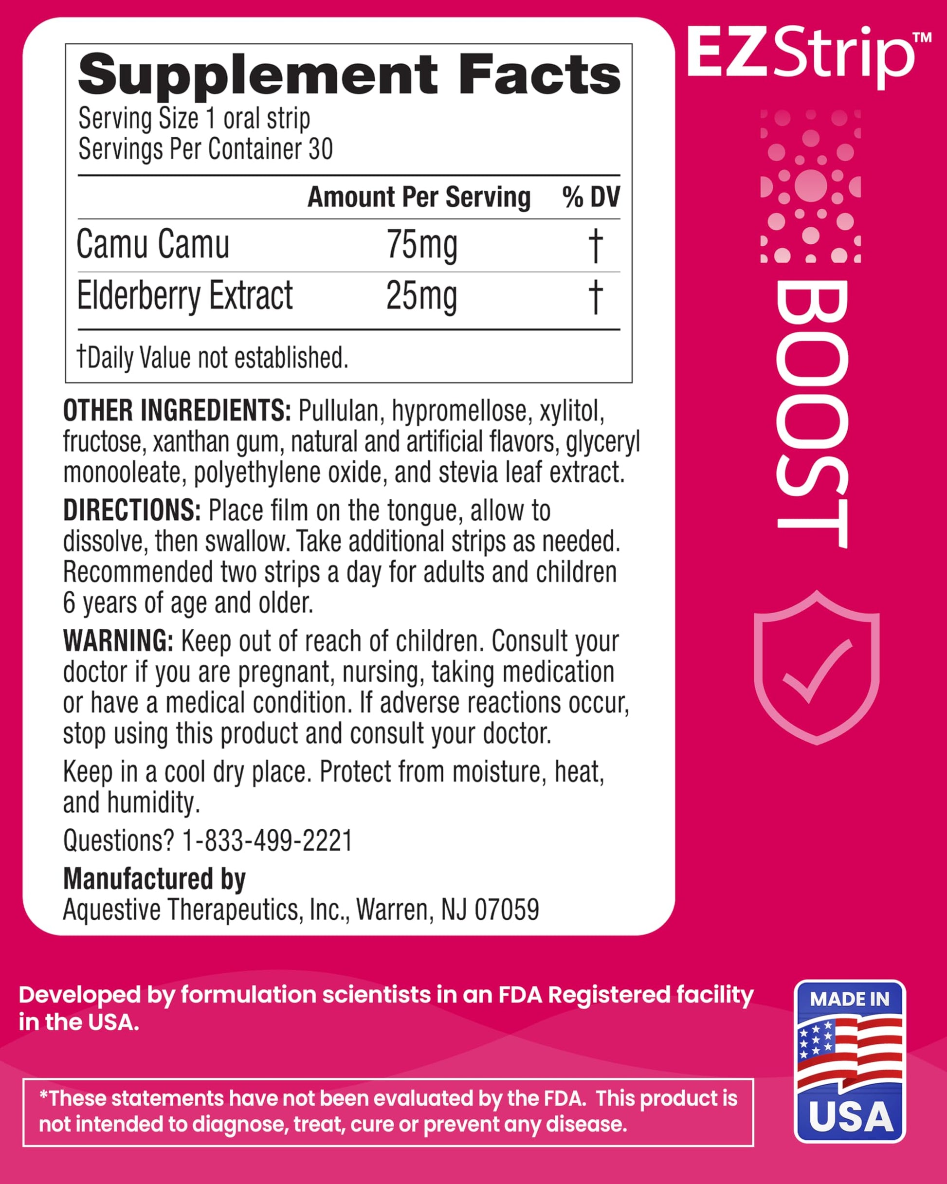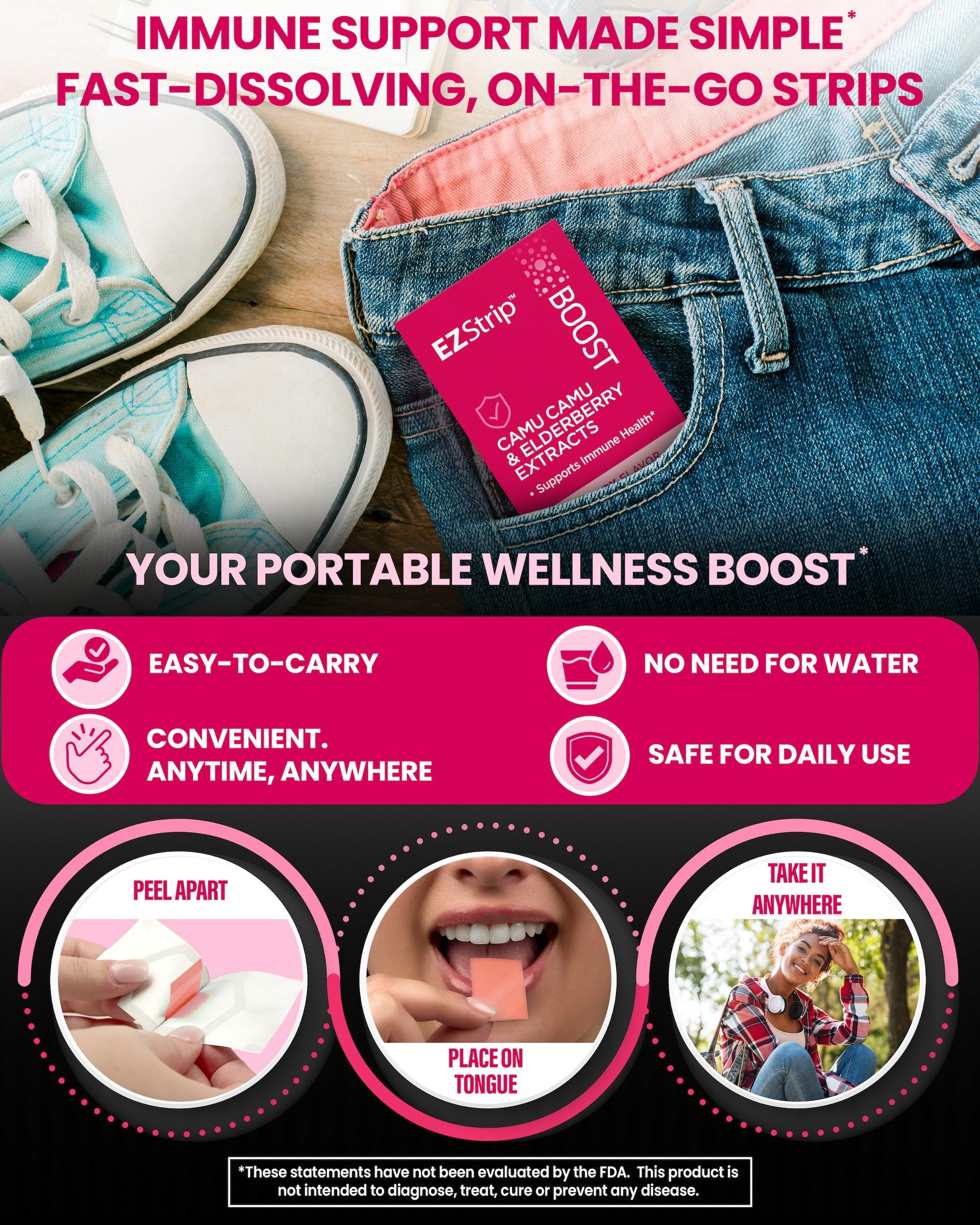 EZStrip Boost Immune Support Supplement - Mixed Berry Flavor, 30 Count - Dissolving Strips with Camu Camu and Elderberry to Help Support Immune Health - Made in The USA, Sugar and Gluten-Free