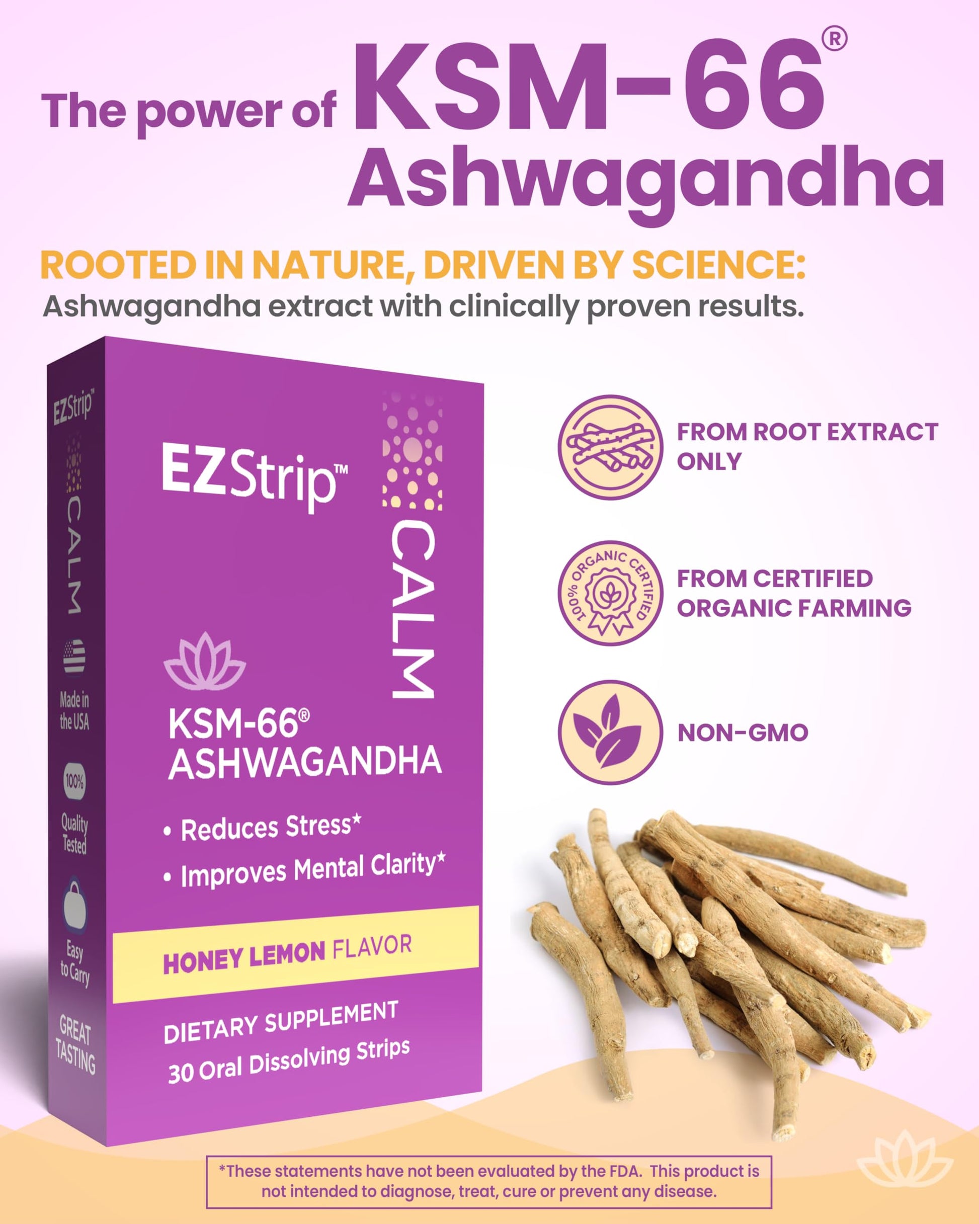 EZStrip Calm Supplement - Honey Lemon Flavor, 30 Count - Dissolving Calming Strips with Ashwagandha KSM 66 Help Support Stress Relief - Made in The USA, Sugar and Gluten-Free