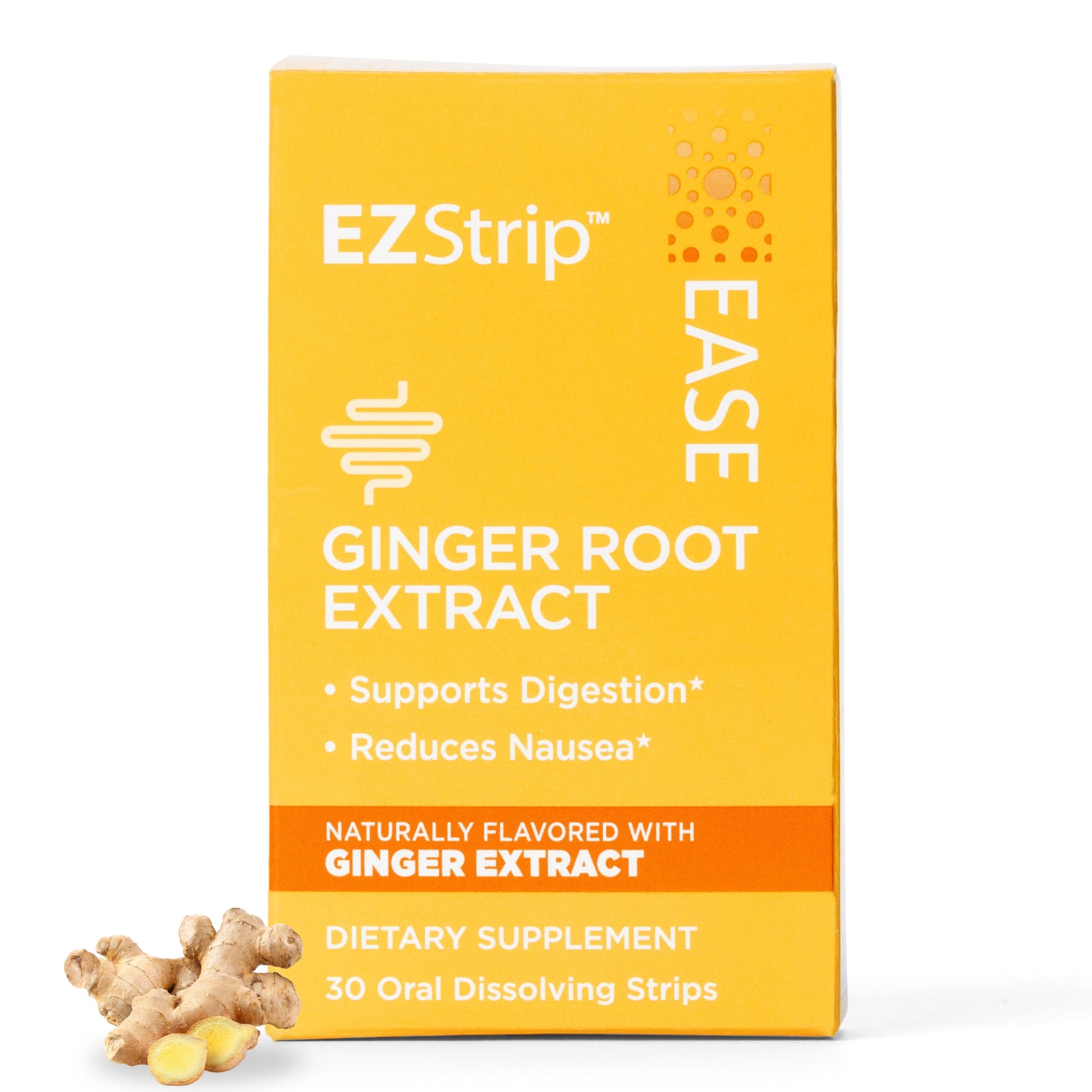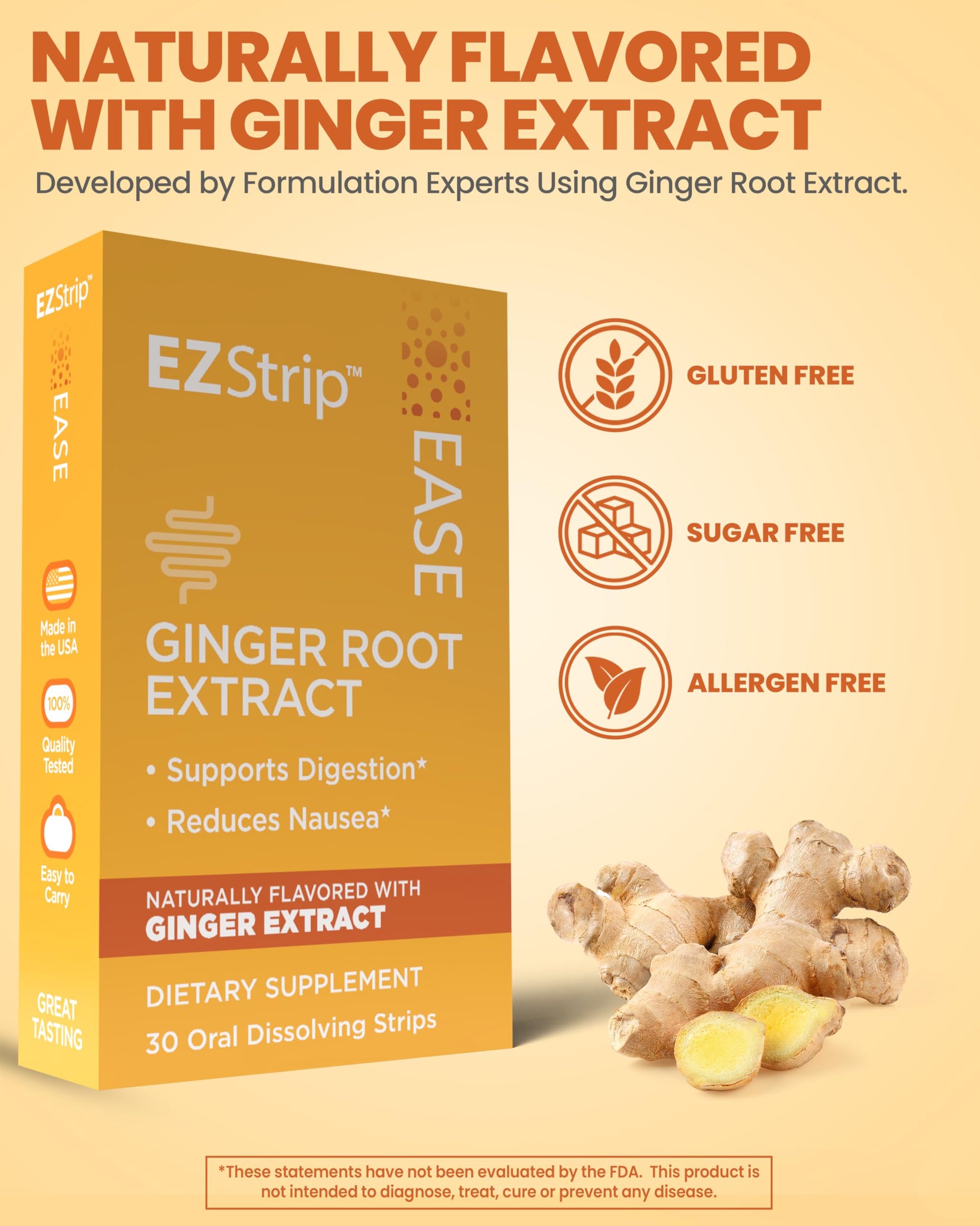 EZStrip Ease Supplement - Ginger Flavor, 30 Count - Dissolving Strips with Ginger Root Help Support Nausea Relief, Morning and Motion Sickness, and Digestion - Made in The USA, Sugar and Gluten-Free