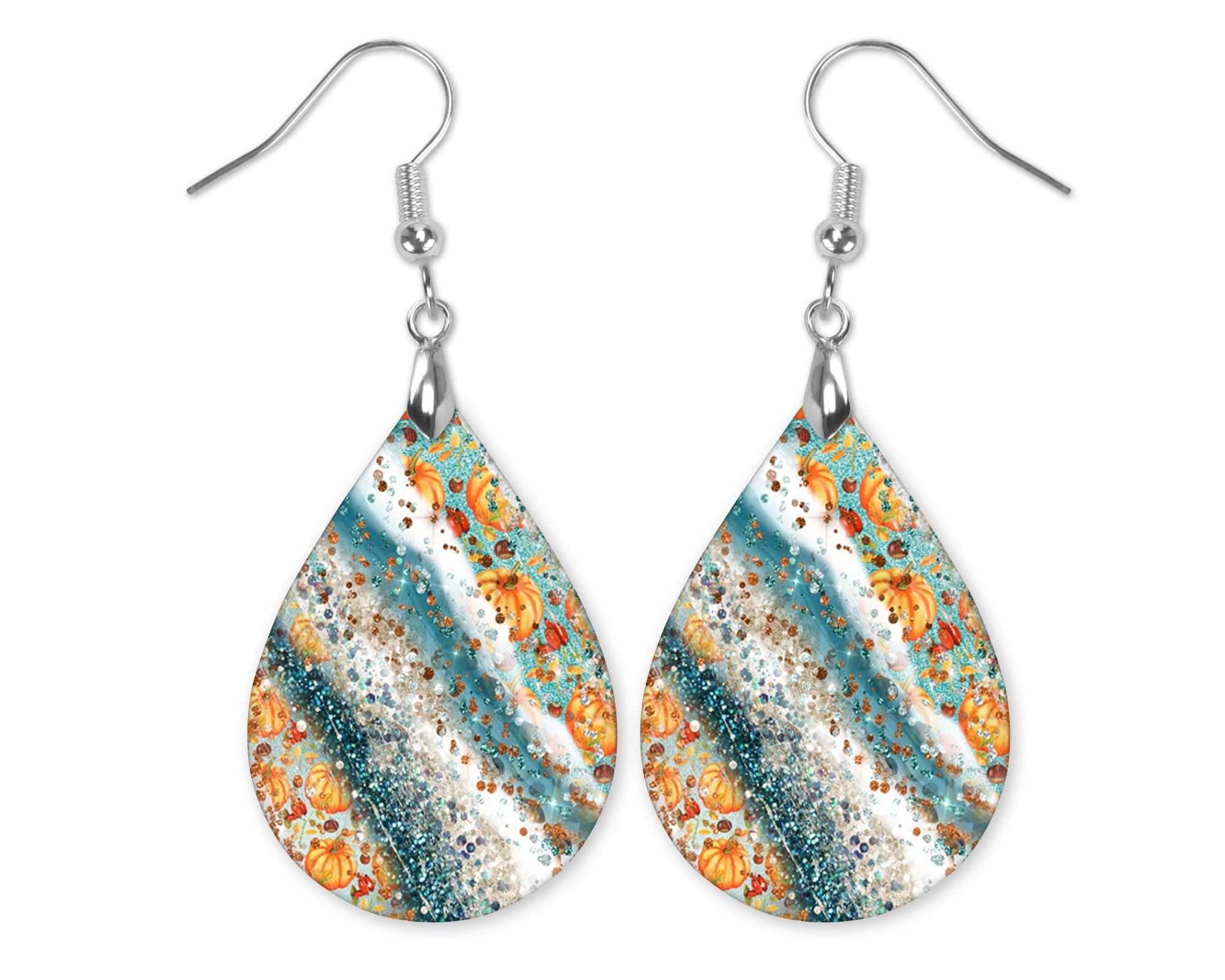 Fall Earrings for Women Autumn Lightweight Teardrop Dangle Fun Colorful Statement Jewelry Handmade by the Painted Pug (Fall Scene) (Teal Pumpkin Milkyway)