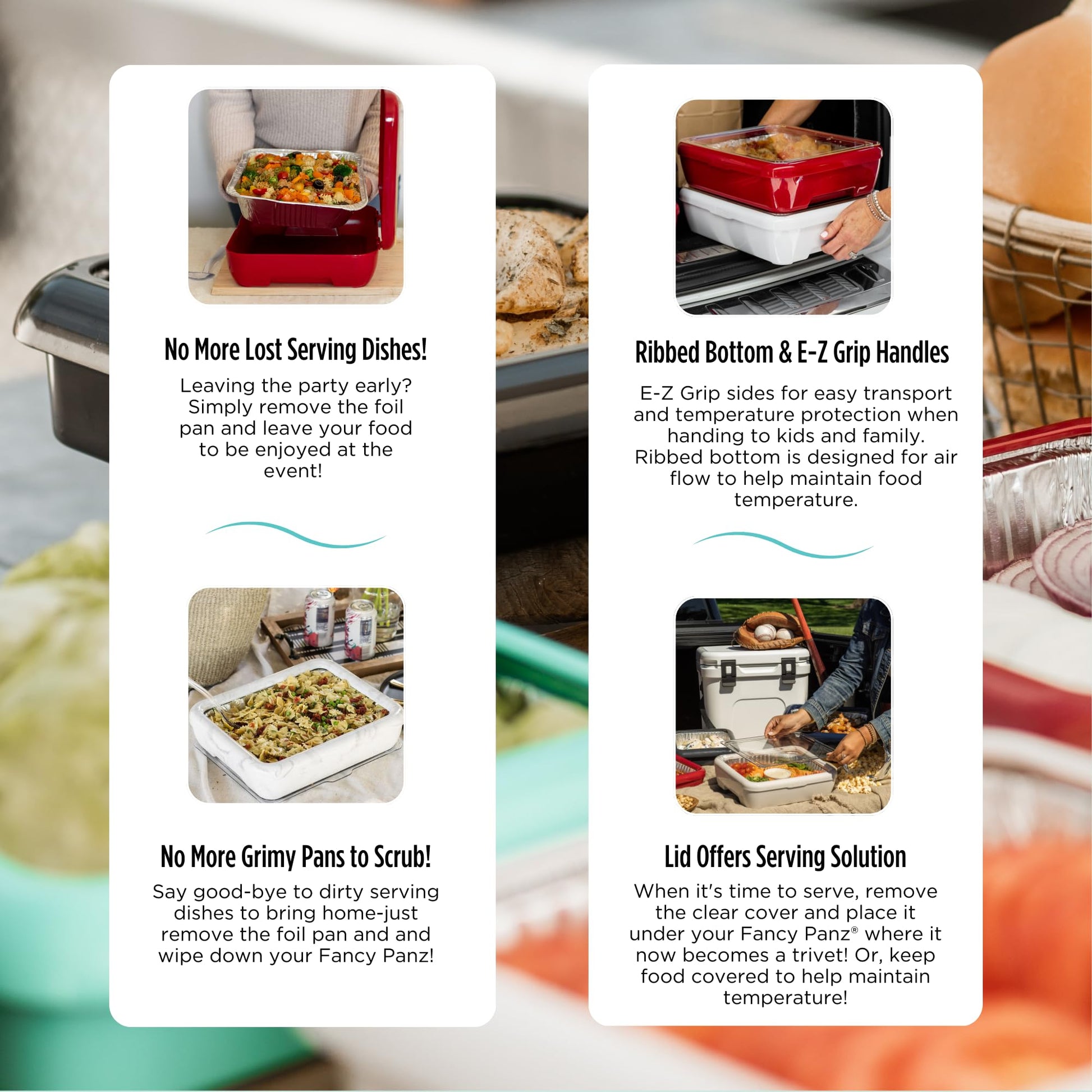 - VERSATILE SERVING OPTIONS: leave the clear lid on & lift the tab to help maintain food temperature, or remove the top & place it underneath as a trivet. Includes one Fancy Panz, one foil pan, and one reusable serving spoon.