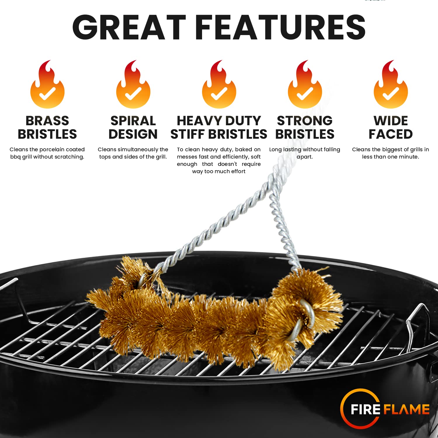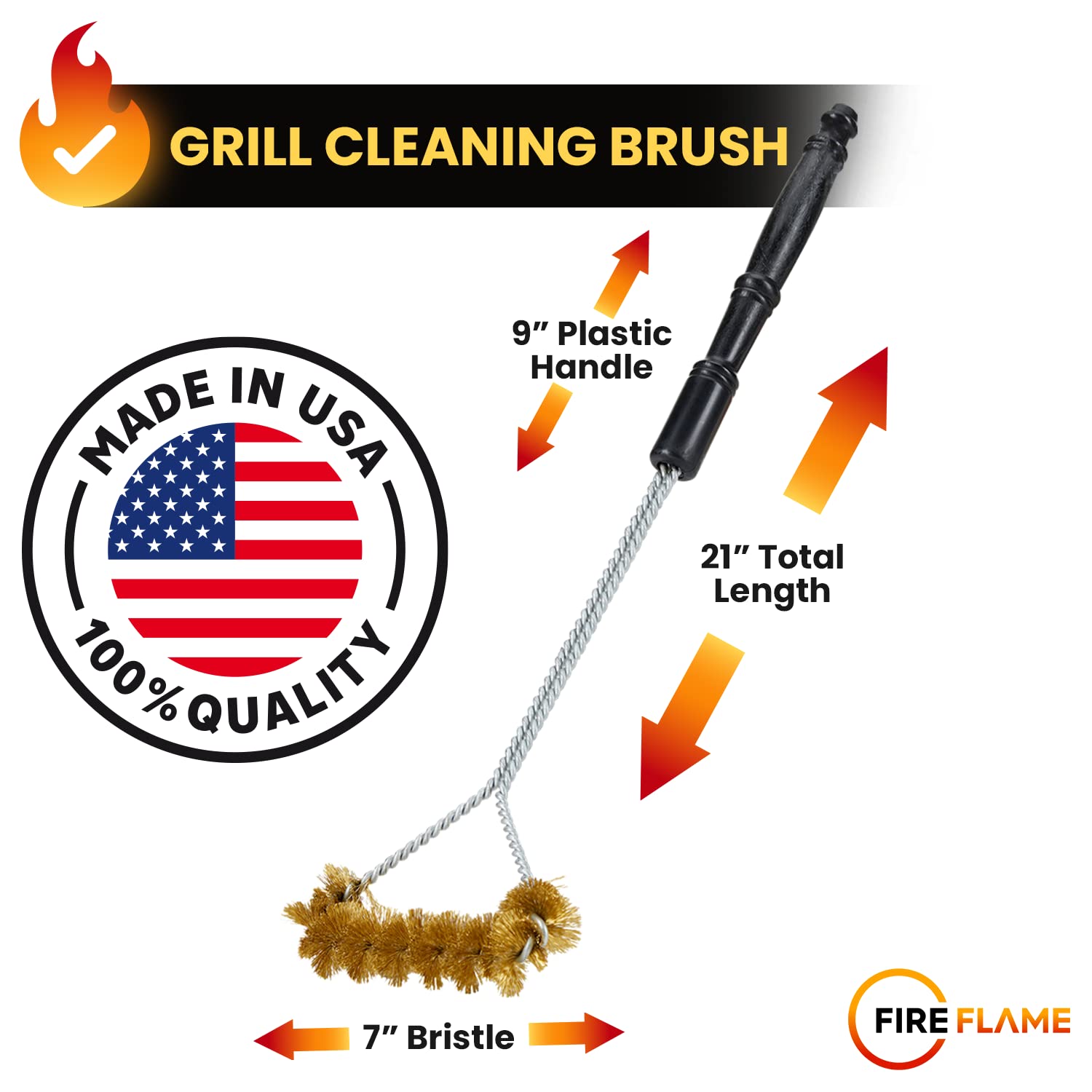 Fireflame BBQ Grill Brush – Non-Scratch Brass Bristles - 21-Inch Long Handle Barbecue Grill Cleaning Brush - Wide-Faced Spiral Heavy-Duty – Made in The USA