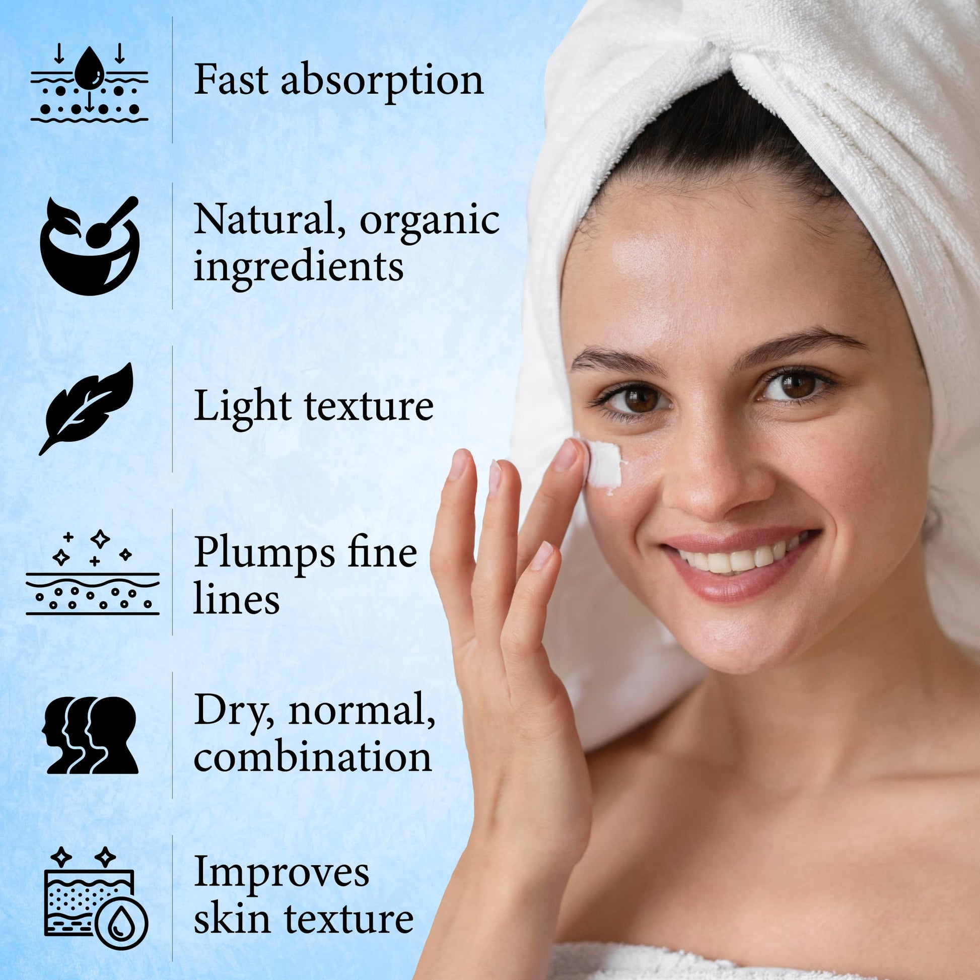 - PLUMP UP WITH PEPTIDES AND HYALURONIC ACID - Our anti-aging moisturizer is made with a very simple goal in mind: Helps to reduce the appearance of wrinkles and enhance skin firmness. It provides ultimate nourishment, deep long-lasting hydration and rejuvenate your skin. All the ingredients present in our anti aging peptide cream help to restore and strengthen the skin, minimize signs of aging.