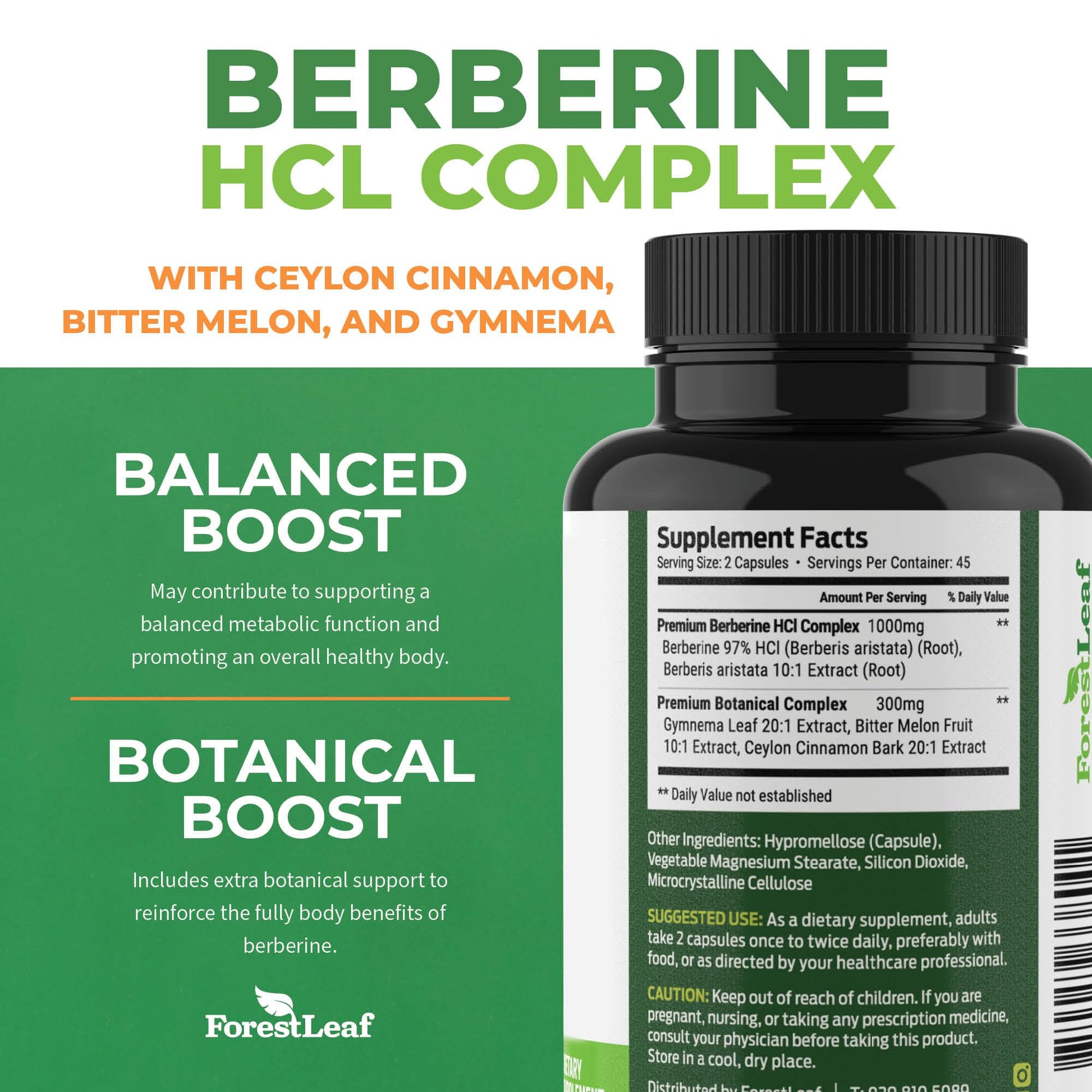 Details: FULL SPECTRUM BERBERINE BENEFITS - ForestLeaf's advanced dual berberine complex not only brings you the traditional benefits of berberine, but also gives you multiple forms to enhance the full spectrum of effects - with comprehensive support for the next step of your journey. 97% TESTED PURITY 10:1 EXTRACT - Our berberine HCl supplement represents the highest available purity at 97% concentration, complemented by a powerful 10:1 extract. This ultra-high-purity formula is designed for those seeking the maximum dose for peak effectiveness. ENERGY WITH NATURE'S TOUCH - Berberine can support natural energy levels by supporting the activity of enzymes like AMPK related to energy utilization in the body. Receive a potent berberine 1000mg dose in each 2 capsule serving, along with 300mg of our supportive botanical complex. WITH CEYLON CINNAMON & MORE - Our berberine hydrochloride supplement also includes ceylon cinnamon, bitter melon, and gymnema for additional botanical support. These plant-based, herbal ingredients are included to support the benefits of berberine. QUALITY TESTED & MADE IN USA - 100% natural and free of artificial additives, including sugar, gluten, dairy, nuts and soy. Non-GMO and Made in the USA. ForestLeaf is committed to the highest quality ingredient sourcing and production processes. All products are third-party laboratory tested and independently verified for both potency and absorption.