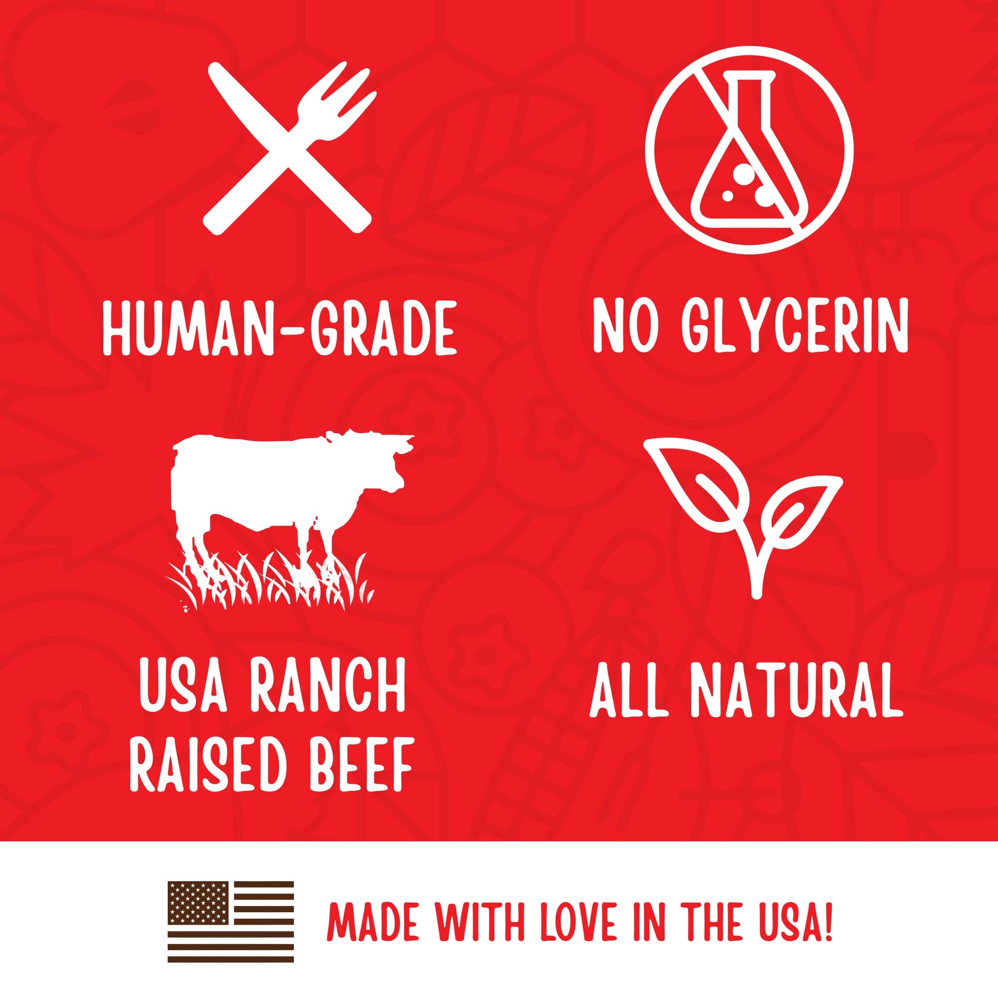 • NO GLYCERIN, GRAINS, CORN, WHEAT OR SOY: Our all natural treats are made from wholesome, healthy recipes; Every bite is free from fillers, artificial flavors, preservatives, and colors and chock full of real meat flavor