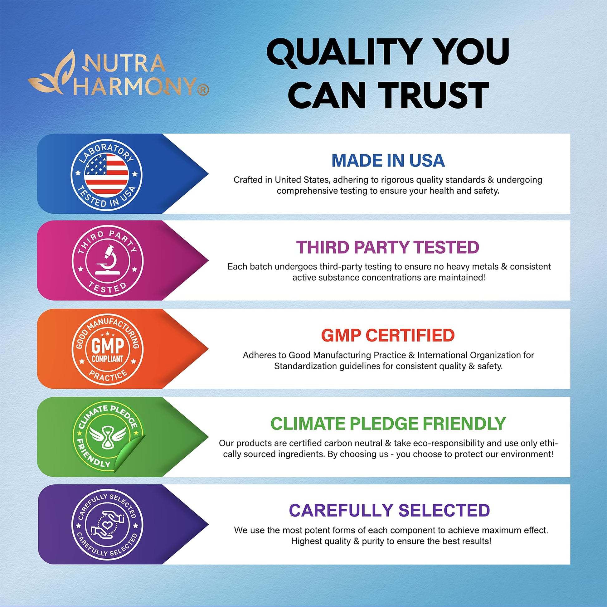 - Trustworthy Service — We are committed to providing exceptional customer service and transparency with NUTRAHARMONY’s carefully selected joint support supplements! With Glucosamine Chondroitin, you can trust that you're receiving a premium-quality supplement backed by scientific research and dedicated customer support!