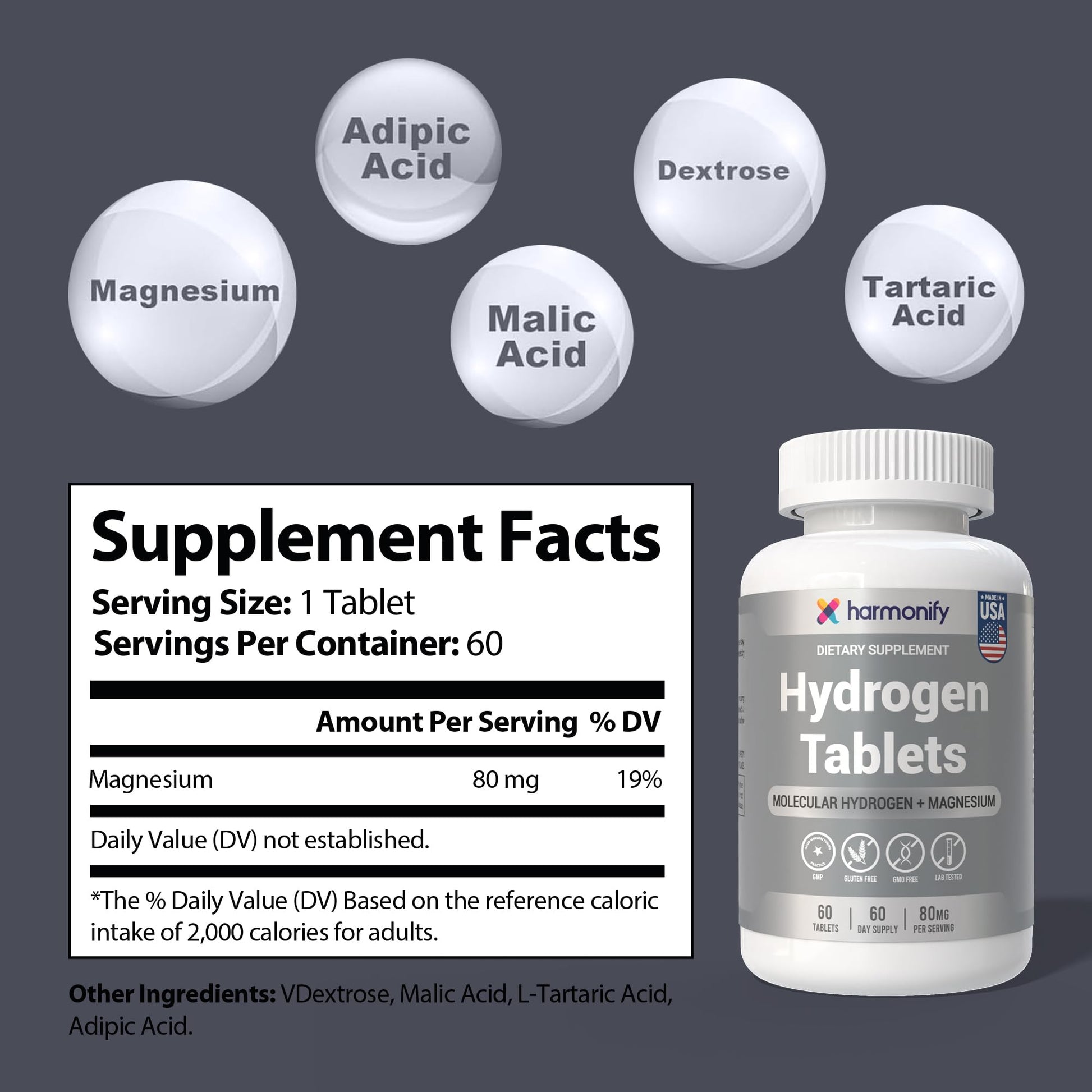 - Premium Molecular Hydrogen Formula: Harmonify Hydrogen Water Tablets are expertly crafted to create hydrogen-rich drinking water, providing powerful antioxidant support and promoting overall cellular health. Each tablet delivers 80mg of pure magnesium for enhanced benefits.