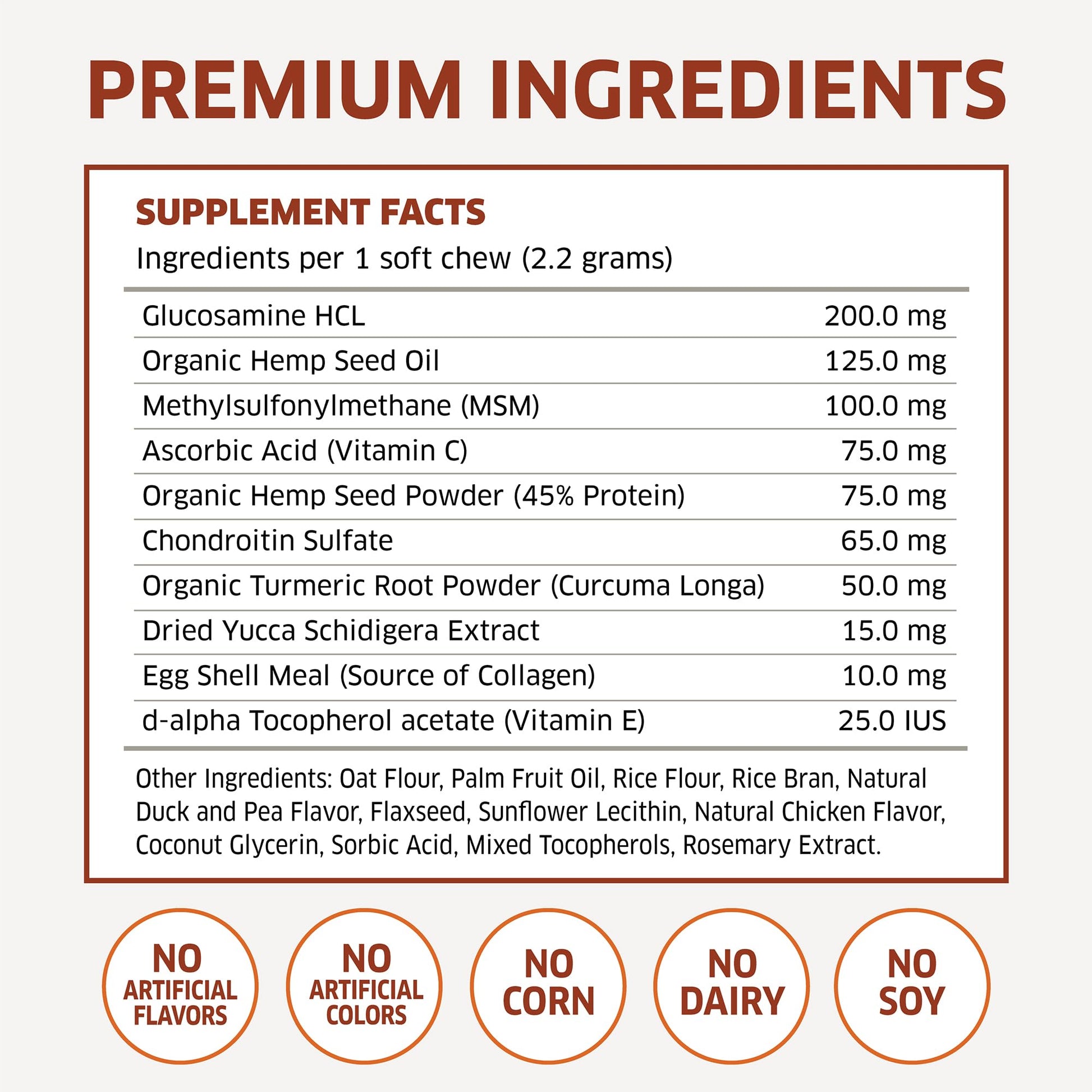 - NATURAL & ORGANIC INGREDIENTS - Our dog glucosamine chews contains NO CORN, SUGAR, WHEAT, ARTIFICIAL FLAVORS, COLORS or GMOs.
