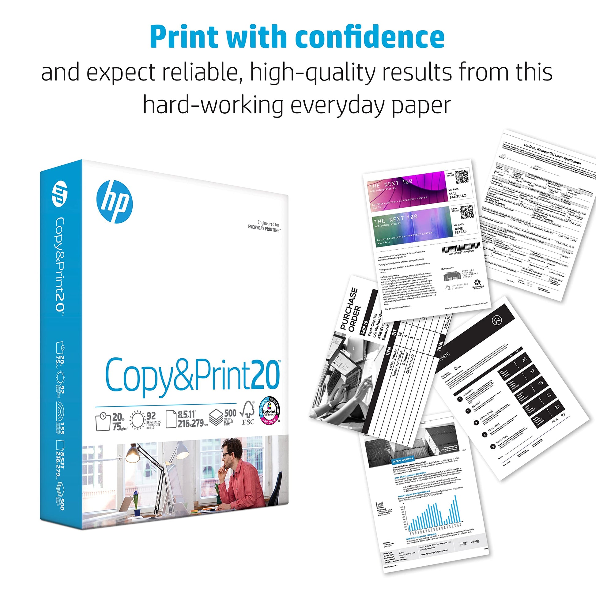 Details: HP Papers is a premium line of uncoated printing paper optimized to provide superior print paper performance when used with HP hardware and supplies and in all other makes and models of printing and copying equipment. Launched in 1996, HP Papers are manufactured and marketed exclusively worldwide in over 75 countries by Sylvamo, a globally recognized leader in paper products, under license from the Hewlett-Packard Company. With a diverse range of products designed to support a wide range of print applications, from everyday copies to full-color presentations, you can be assured of consistent, high-quality print performance every time. HP Copy&Print20 Paper is a 20 lb, super smooth, economical and multipurpose paper for everyday printing at home, at school and in the office. HP Copy&Print20 offers HP quality and reliability at a great value. Its ultra white shade (92 bright, 155 whiteness) and ColorLok Technology provides brighter colors and bolder blacks for reports, school work and all general printing needs. HP Copy&Print20 printer paper is available in 8.5 x 11 letter size paper.