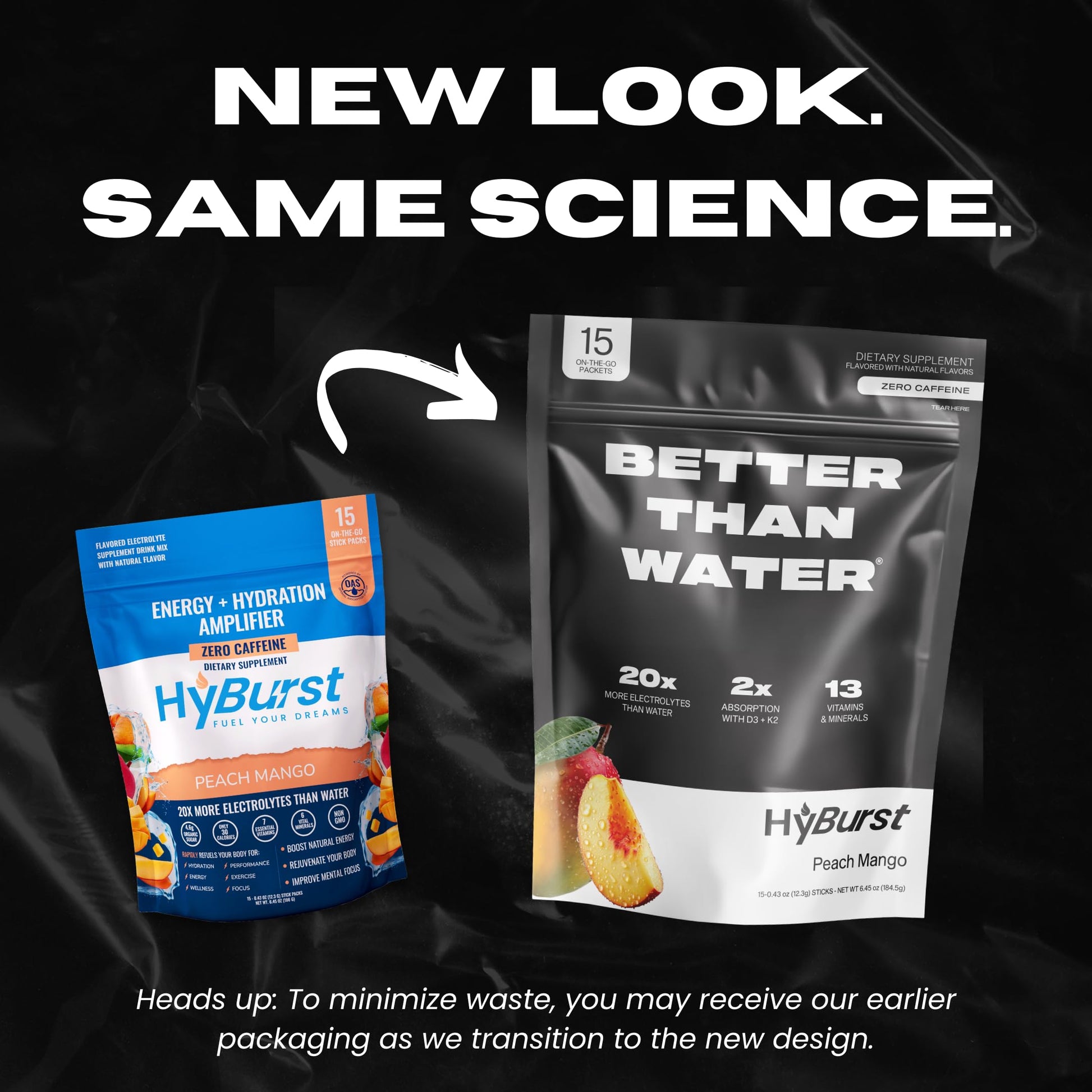 Hyburst Electrolyte & Vitamin Supplement Powder, Drink Mix with B12, L-Theanine, D3, K2, Zinc, Magnesium, Potassium, Supports Calm Focus & Energy, Peach Mango, 15 Pack