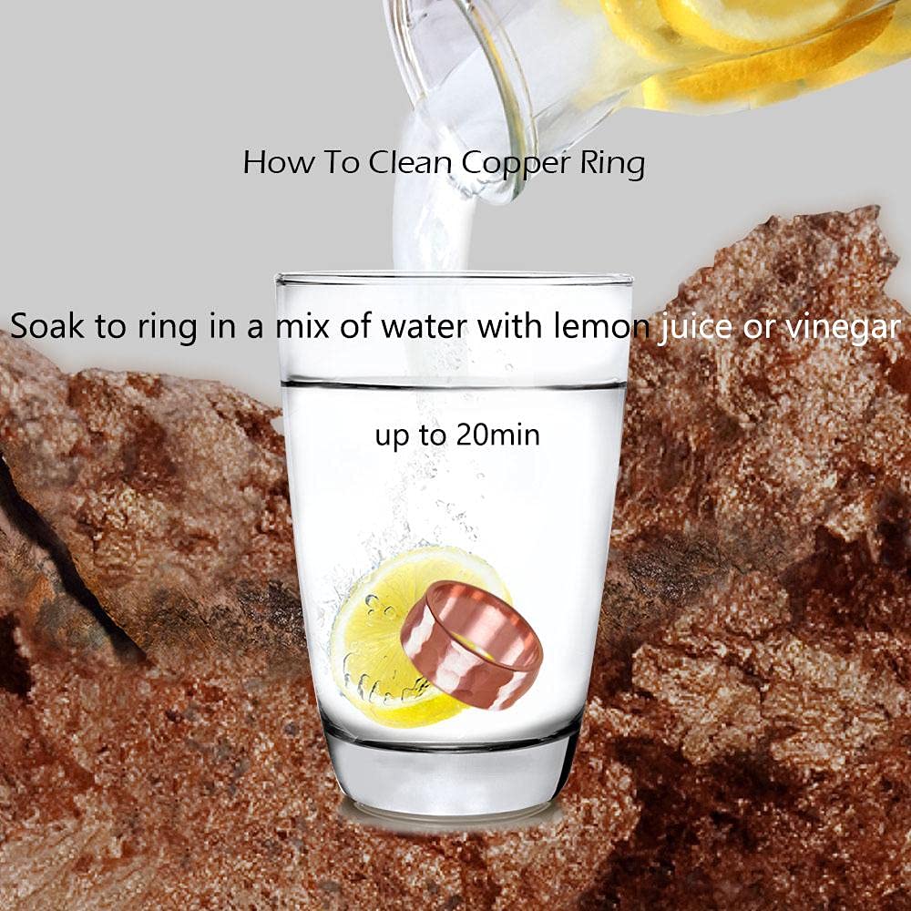 - [How to Clean Copper Ring and Finger] The copper ring can be cleaned by soaking in a mix of water and lemon juice or vinegar up to 20 min. before rinsing off with clean water. Greenish stains can be washed off with water and soap.