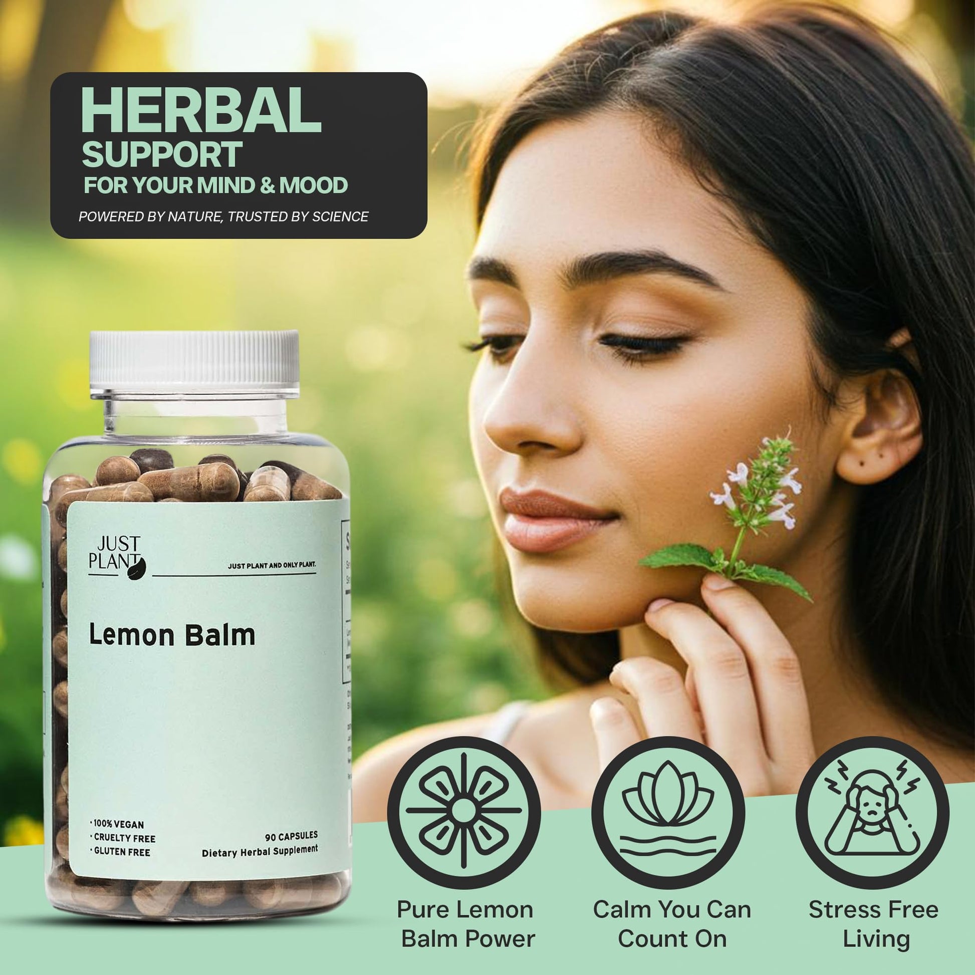 Just Plant Lemon Balm, 750 mg, 90 Vegan Capsules, Calming Herbal Support for Stress Relief, Calm Mood & Focus, Gluten-Free, GMP Certified