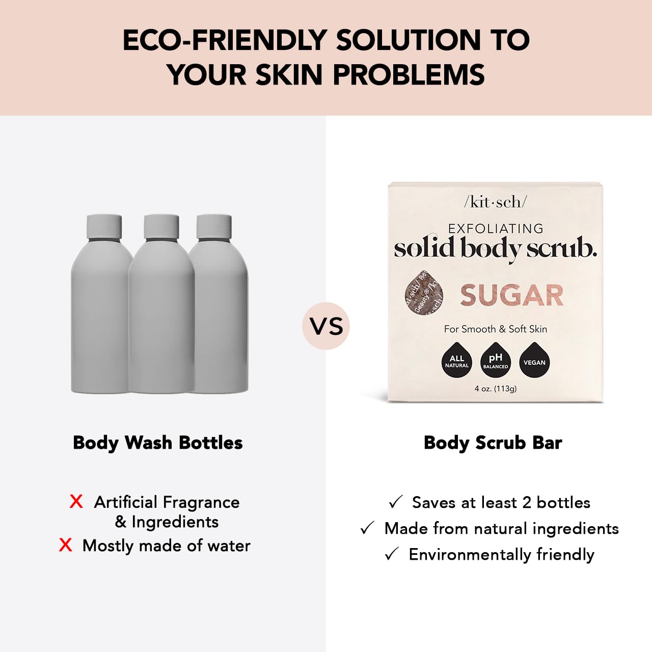 - SAVE MONEY WHILE SAVING THE ENVIRONMENT: Kitsch's all-natural body scrub for women and men is 100% compostable, zero waste, and plastic-free. Our sugar scrub body bars don't come in plastic bottles, which saves atleast 2 liquid bottles of liquid body wash, making it the best exfoliating body wash for men and women.