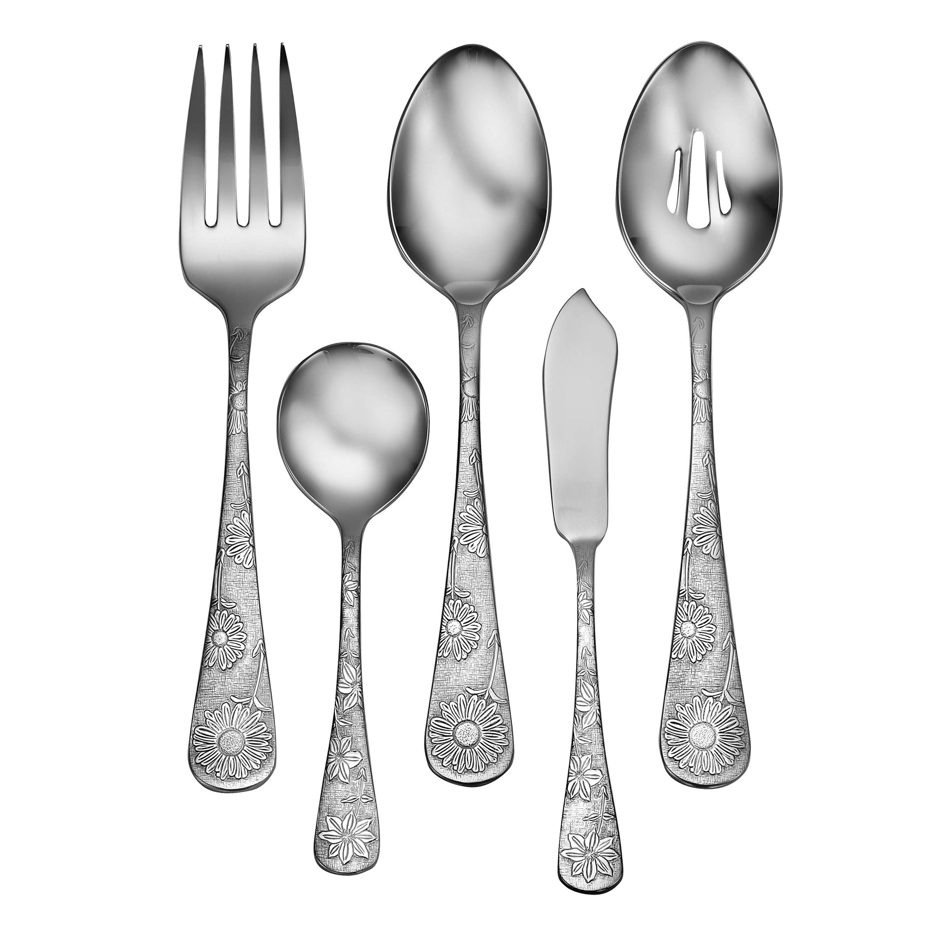 - 45PC SET INCLUDES: 8 Dinner Forks, 8 Dinner Knives, 8 Place Spoons, 8 Teaspoons, 8 Salad Forks, 1 Serving Spoon, 1 Slotted Spoon, 1 Butter Knife, 1 Sugar Spoon, 1 Cold Meat Fork