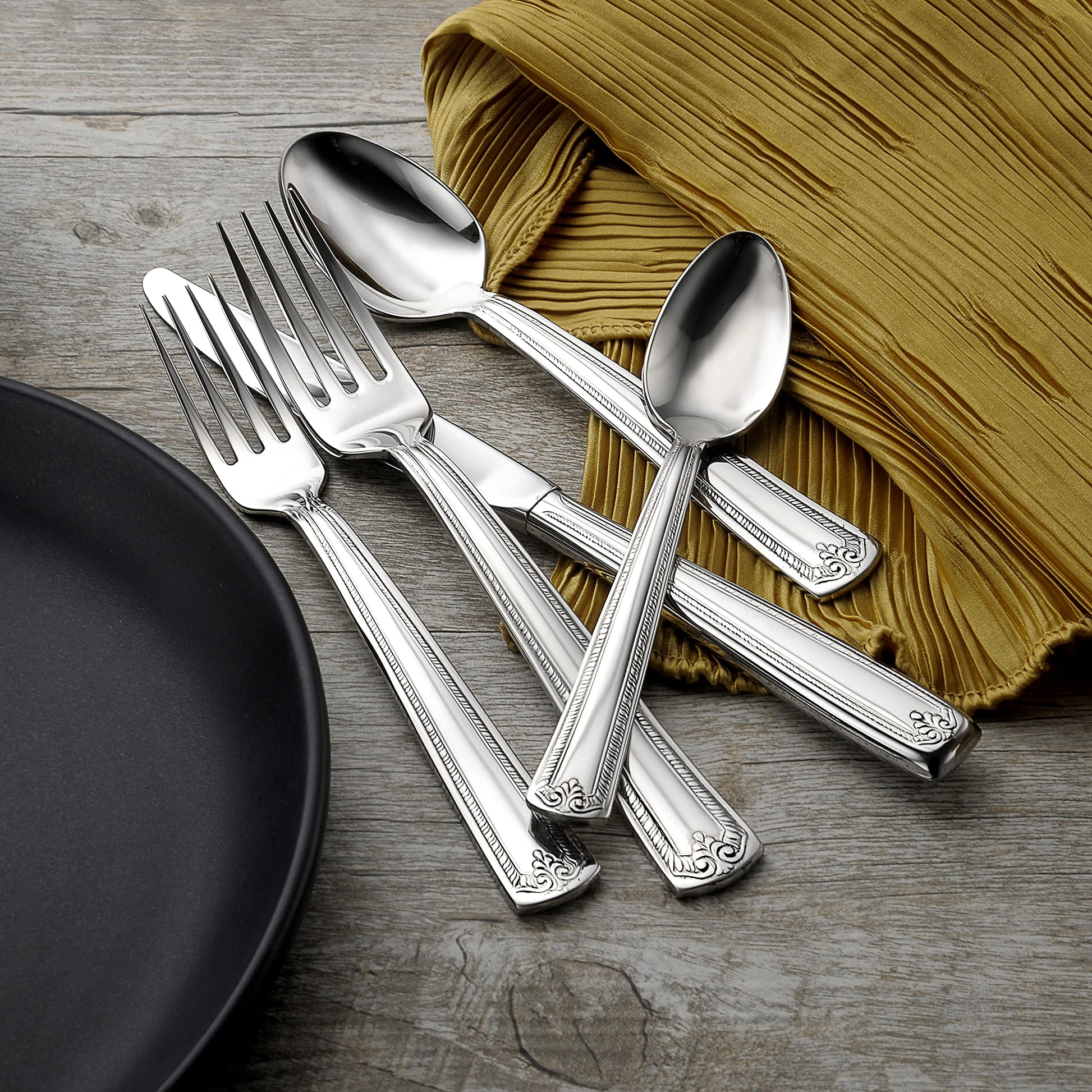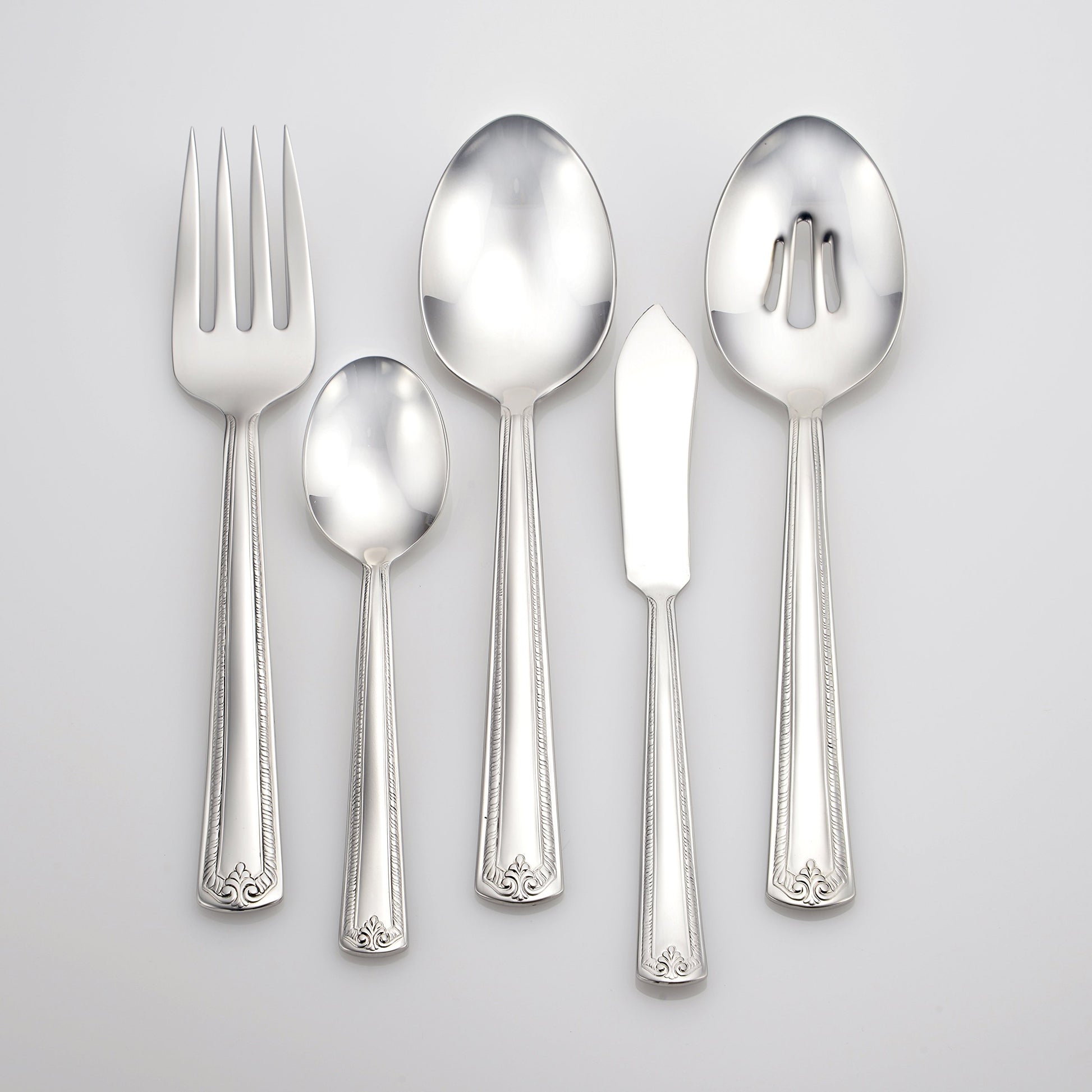 - 45PC SET INCLUDES: 8 Dinner Forks, 8 Dinner Knives, 8 Place Spoons, 8 Teaspoons, 8 Salad Forks, 1 Serving Spoon, 1 Slotted Spoon, 1 Butter Knife, 1 Sugar Spoon, 1 Cold Meat Fork