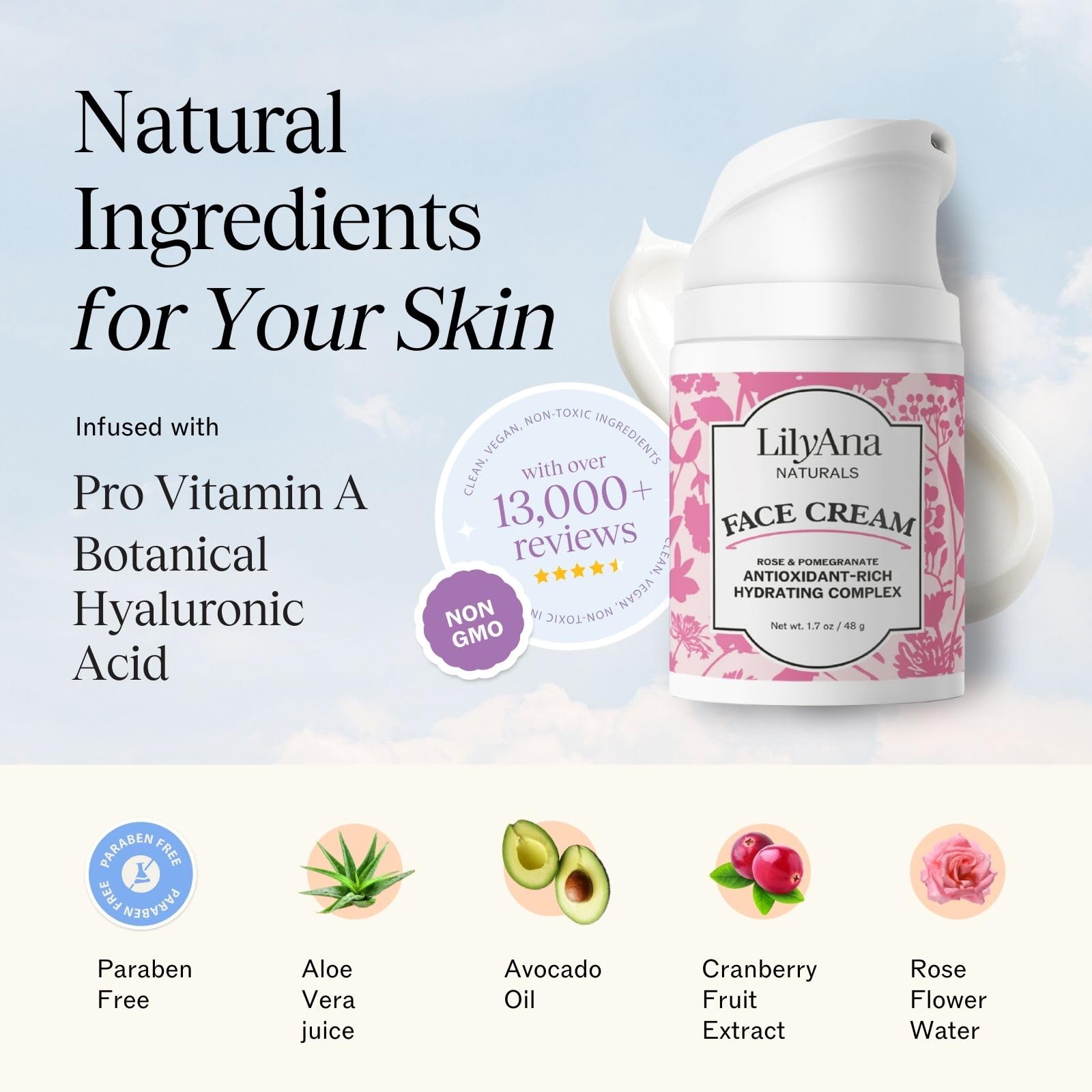 LilyAna Naturals Face and Neck Moisturizer for Women and Men - Moisturizer Face and Neck Cream for Dry Skin and Dark Spot Brightening - Rose and Pomegranate Extracts - 1.7oz
