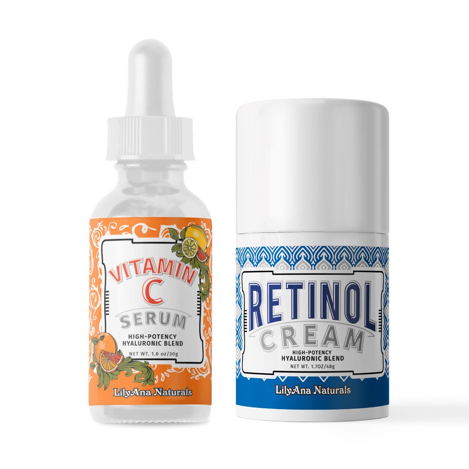 LilyAna Naturals Retinol Cream Moisturizer 1.7 Oz and Vitamin C Serum 1 Oz Bundle - For Face and Eyes, Men and Women - Daily use for Acne, Anti Wrinkle, Anti Aging, Fades Age Spots and Sun Damage