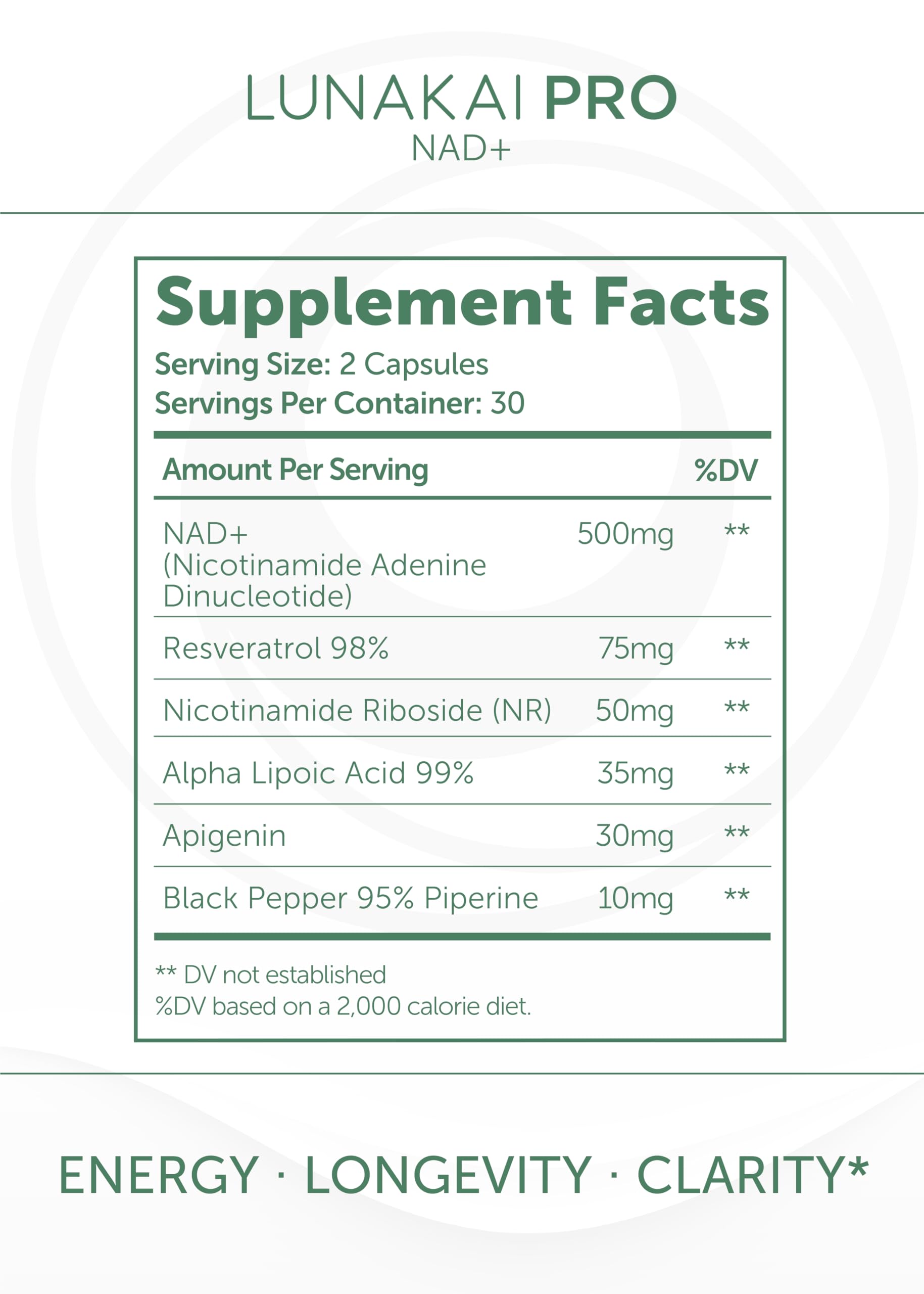 Lunakai PRO USA Made Dual-Pathway NAD+ Formula with NR & Resveratrol – Natural NAD Supplement for Women & Men – Longevity & Cellular Health Support, 60ct