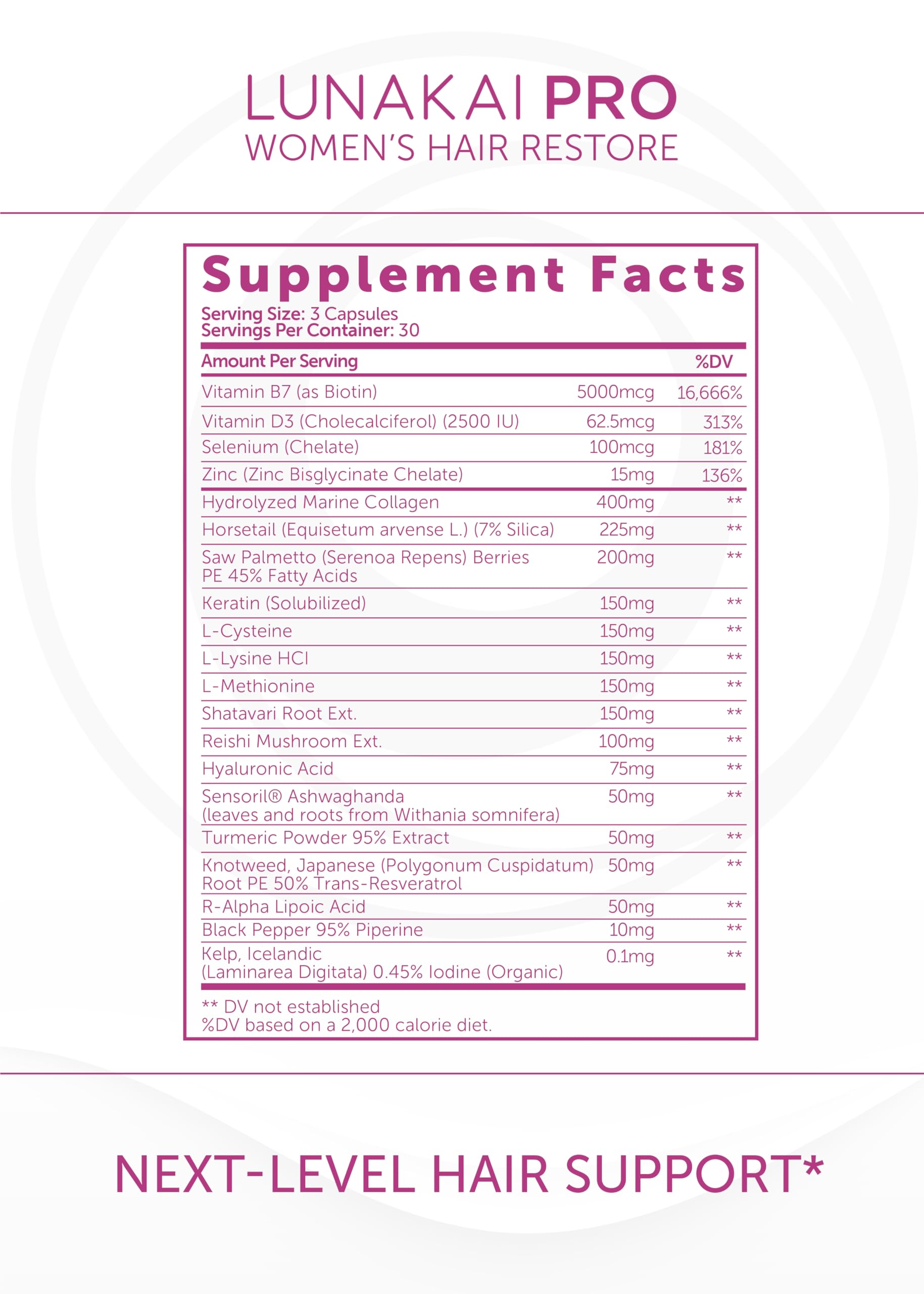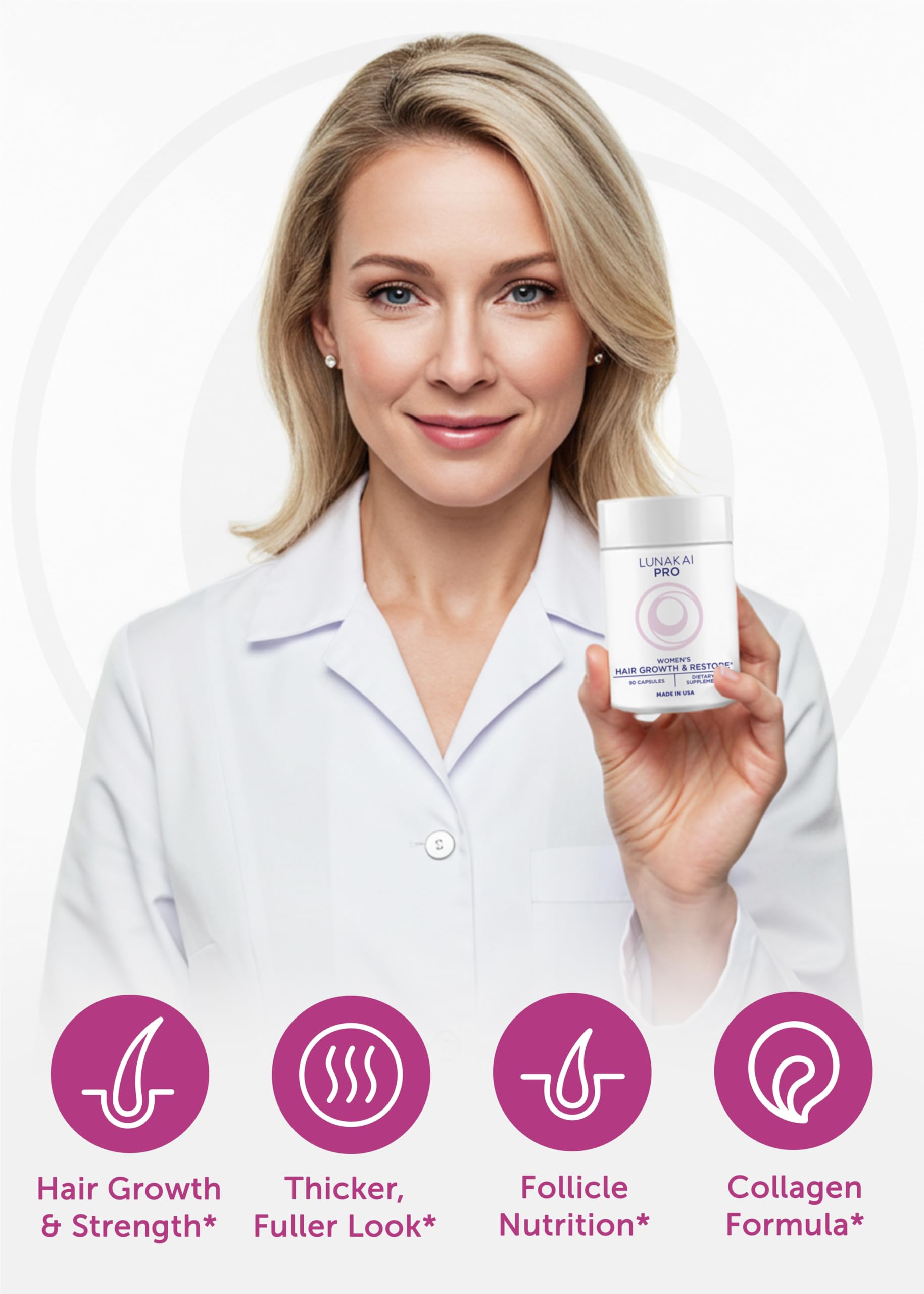 Lunakai PRO USA Made Women’s Hair Growth & Restore Vitamins – Advanced 15+ Nutrient Complex for Visible Results – Natural Thicker Hair Growth Supplement, 90ct