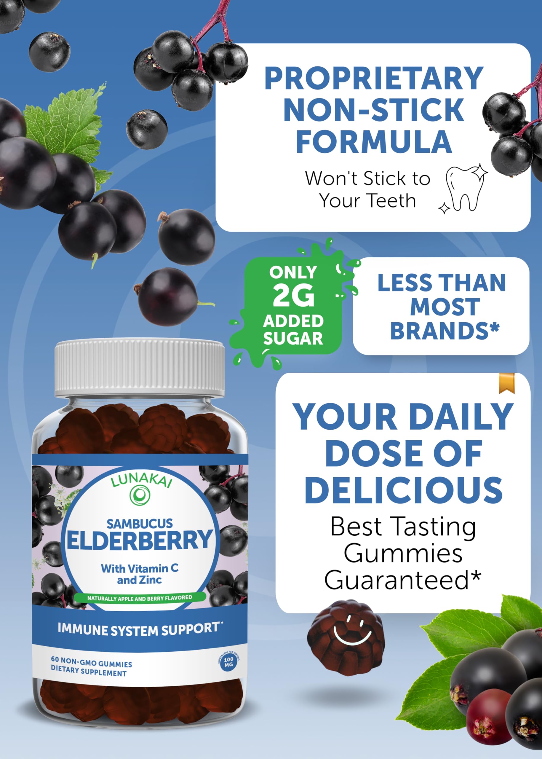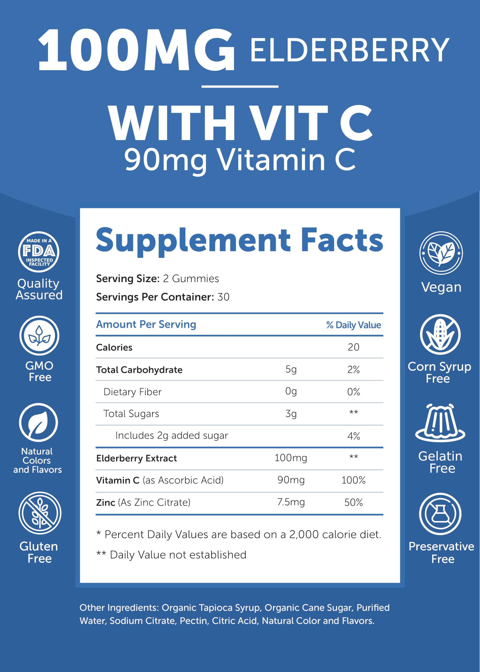 - Potency Packed Without the Bad Stuff - Non-GMO, Gelatin Free, Vegan, Gluten Free, Soy Free - 100 mg of Elderberry which delivers naturally occurring free radical defenders into the body called anthocyanins, along with 90 mg of Vitamin C & 7.5 mg of Zinc, makes this the perfect antioxidant rich gummy for immunity.