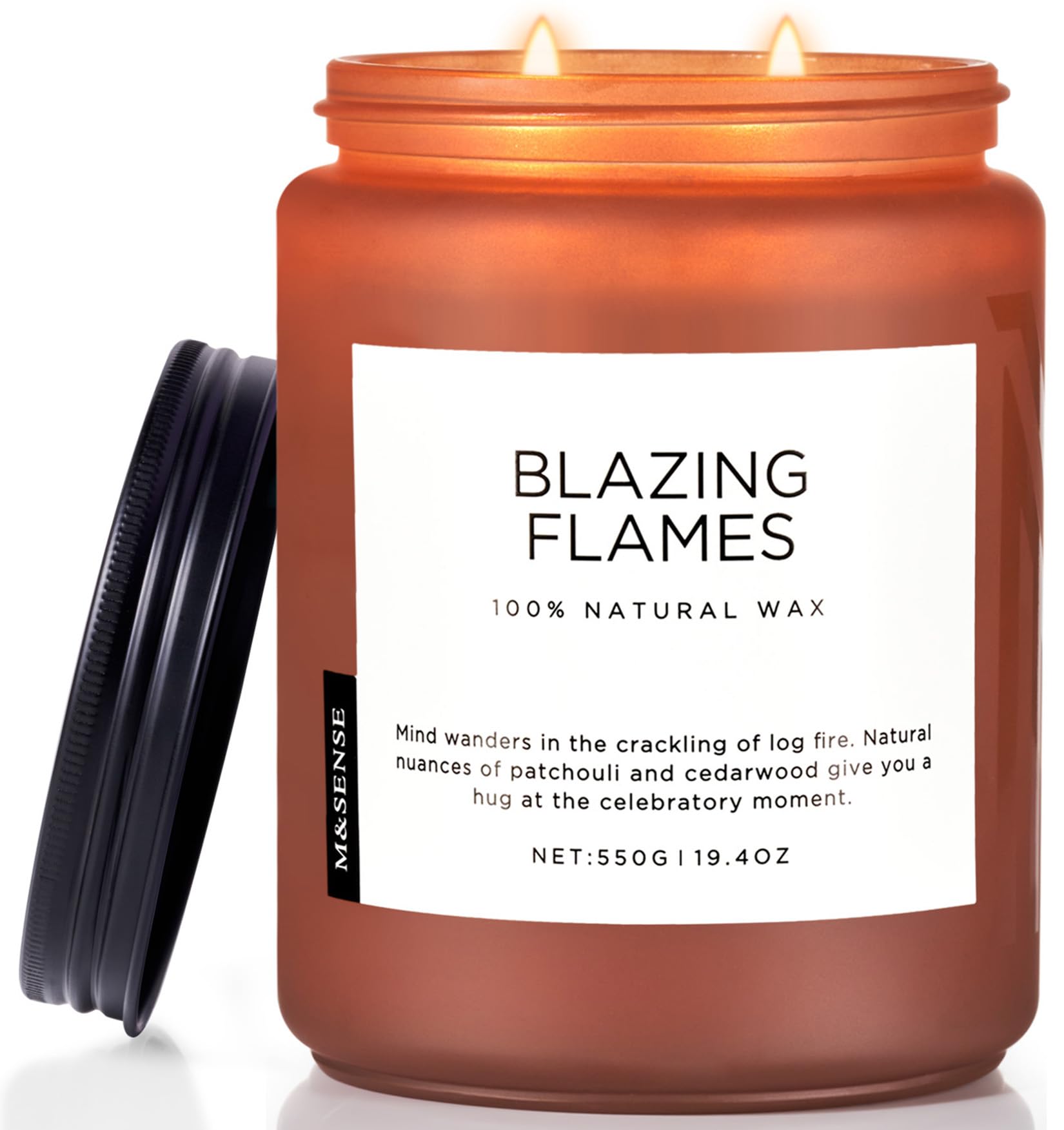 M&SENSE Blazing Flames Scented Candles with Log Fire - Patchouli & Cedarwood, Large Natural Soy 19.4oz 110 Hour Long Lasting Non Toxic Clean Burn Candle Gifts for Men Women