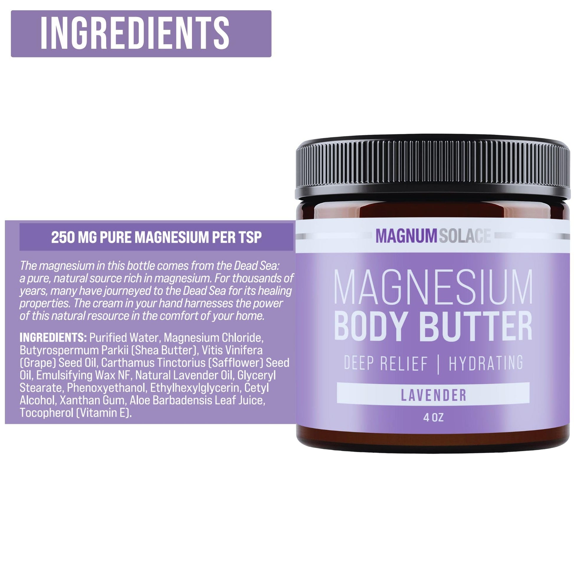 - SUPERCONCENTRATED: Magnum Solace Magnesium Body Butter contains 250 mg magnesium per tsp (6,000 mg per jar). Compare with other topical magnesium chloride products, this packs a punch!